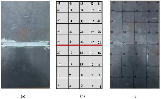 EMA nodal planning, (a) FSWed plate, (b) measurement and excitation coordinates (red line corresponds the weld line), (c) portioned plate.