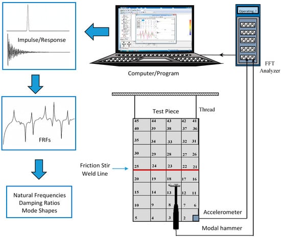 This study uses EMA to investigate the dynamic properties of friction stir-welded AA7075 plates. Unlike theoretical methods, EMA is a data-driven approach that measures a physical structure’s response to an applied excitation force, typically from a modal hammer or shaker. The core of this process is the collection of paired excitation and response data, which is then used to compute Frequency Response Functions (FRFs). Acting as a dynamic fingerprint, each FRF is the frequency-domain ratio of the system’s output to its input, capturing crucial information about the structure’s behavior under dynamic loads.