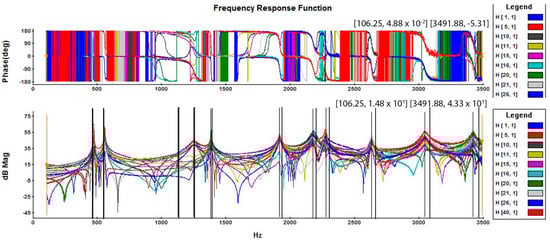 The acquired time-domain data were converted to the frequency domain by performing a Fast Fourier Transform (FFT), and Frequency Response Functions (FRFs) of the accelerance type were obtained from the ratio of the response to the excitation. This data can also be integrated to be converted into mobility and receptance. Some of the FRFs for one of the samples are presented in Figure 9.