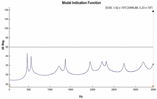 The Modal Indication Function, derived from the obtained FRFs, was then processed over a selected frequency band (0–3500 Hz) to extract the first 11 resonance frequencies of the sample. Based on this analysis, Modal Indication Function and Stabilization Chart were generated (Figure 10 and Figure 11).