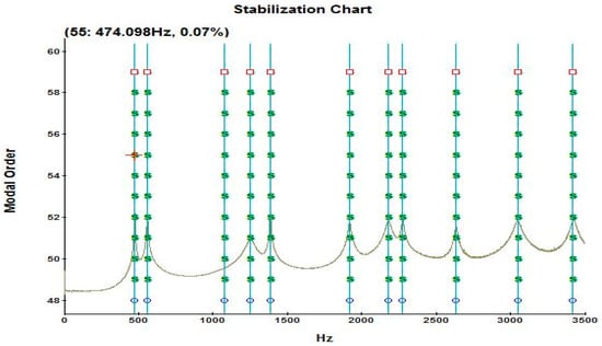 The distinct peaks in the Modal Indication Function (MIF) and Stabilization Chart plots, shown in Figure 10 and Figure 11, respectively, represent the structure’s resonance points, which are its natural frequencies. These peaks indicate the frequencies where the amplitude of an externally applied vibration reaches its maximum, pointing to the modes where the structure stores the highest amount of energy. Therefore, the peaks obtained from these plots allow us to accurately determine the structure’s vibration modes and their corresponding natural frequency values.