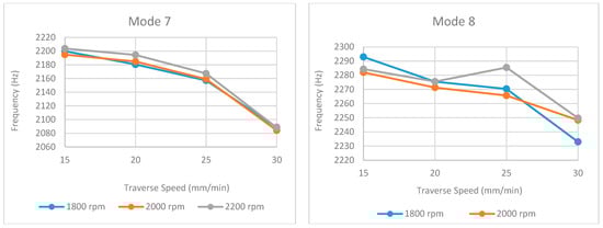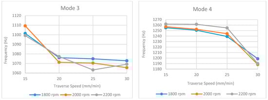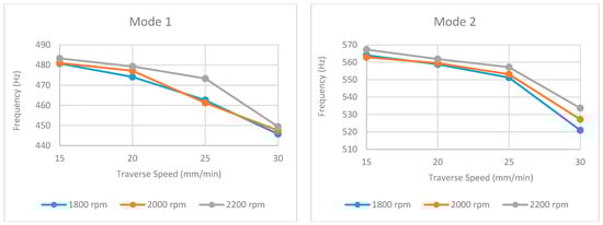 An analysis of the natural frequency values (Table 1, Table 2 and Table 3 and Figure 13, Figure 14, Figure 15, Figure 16 and Figure 17) reveals a consistent decreasing trend with increasing traverse speed across the examined modes. This global reduction is primarily attributed to the decreased heat input per unit length, which hinders adequate material plasticization and promotes the formation of volumetric defects (e.g., tunnel voids, kissing bonds), thereby degrading global stiffness. Notably, this stiffness degradation manifests nonlinearly; while a gradual frequency decline in the 15–25 mm/min range suggests minor microstructural evolution (e.g., precipitate dissolution), the abrupt drop observed at 30 mm/min (particularly evident in modes such as 2 and 4) indicates a critical thermal threshold where severe geometric defects compromise the structural integrity.