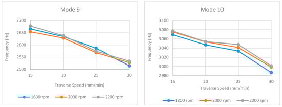 Obtained natural frequencies under different traverse and rotational speeds for mode 9 and mode 10.