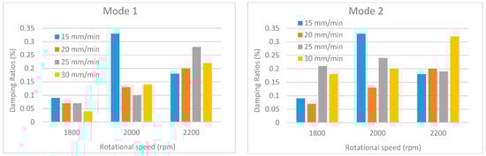 The damping ratios corresponding to the natural frequencies obtained for each mode examined were determined. The damping ratios obtained for different rotational and traverse speeds are presented using comparative bar charts in Figure 18, Figure 19, Figure 20, Figure 21 and Figure 22.