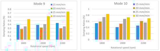 Damping ratios under different traverse and rotational speeds for mode 9 and mode 10.