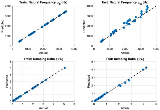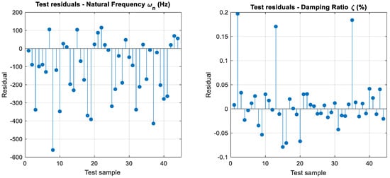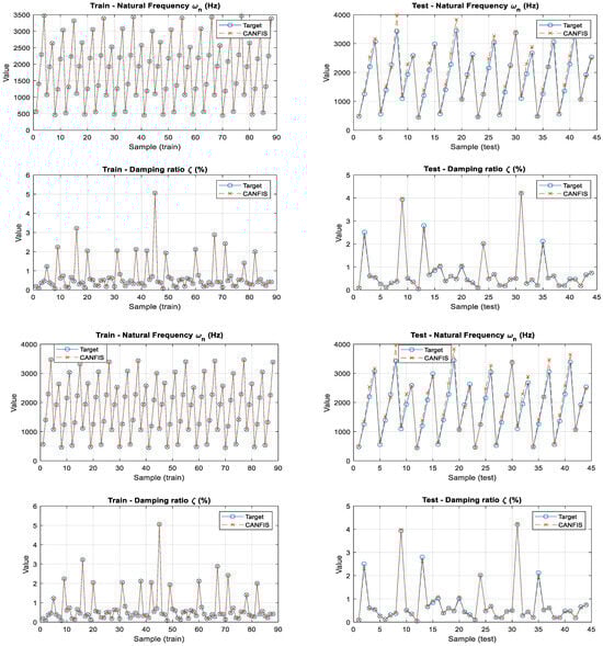 The predictive capability of the proposed CANFIS model was evaluated using both training and testing datasets through a series of graphical analyses. As presented in Figure 26, the agreement between the experimental (target) values and the CANFIS predictions for natural frequency and damping ratio is illustrated for both datasets. The corresponding prediction errors in the test set are further analyzed through the residual distributions shown in Figure 27. Finally, the correlation between the actual and predicted values is assessed using the scatter plots given in Figure 27, providing a comprehensive evaluation of the model accuracy and generalization performance.