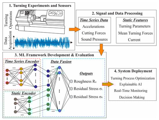 In this study, an experimental publicly available dataset [25] was utilized to ensure transparency, reproducibility and comparability of the results. The selection of this dataset was based on its comprehensive documentation, which details an extensive multimodal experimental study on turning 42CrMo4 + QT using coated cutting inserts. The documented experiments involve multiple cutting-parameter combinations, the corresponding sensor and the resulting surface integrity. Specifically, each experiment is associated with measured surface roughness and residual stress outcomes (longitudinal residual stress and radial residual stress), thereby enabling a multi-task predictive modelling environment. Accordingly, the dataset led to the development of an ML model that fuses a convolutional encoder designed to capture dynamic process behavior from time-series sensor signals along with a static encoder for the applied machining parameters. The resulting fused representation facilitates the accurate forecast of surface roughness and residual stresses by establishing complex nonlinear relationships among sensory, process and cutting tool variables. Additionally, in order to ensure model interpretability and manufacturing relevance, a surrogate meta-model was constructed based on the deep model’s projections and analyzed via Shapley Additive Explanations (SHAP). This interpretability layer quantifies the relative influence of individual cutting parameters and fused-representation components on the predicted outputs, providing a physically consistent interpretation of the learned relationships. Finally, a multi-objective optimization pipeline was also implemented that simultaneously minimizes surface roughness and residual stresses of the manufactured component by generating Pareto-optimal trade-offs in the machining-parameter space. Figure 1 exhibits the overview of the applied approach that integrates DL, interpretable modeling and optimization into a unified workflow, introducing that way a coherent and transparent data-driven operational framework in turning procedures.