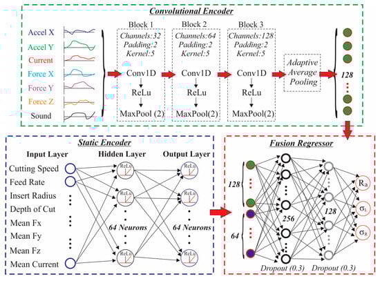 This study introduces a multimodal architecture for the joint modeling of surface integrity. Particularly, the architecture uniquely integrates time-series and static inputs to simultaneously estimate surface roughness and residual stresses. Figure 4 displays the applied multimodal ML framework consisting of three functional components: a convolutional encoder for time-series data, a feed-forward encoder for static variables and a fusion regressor that combined both latent representations into a joint prediction layer. The time-series encoder employed one-dimensional convolutional layers to extract temporal and frequency-related features from the seven-channel signals. More specifically, three convolutional blocks were used, each comprising a convolutional layer with Rectified Linear Unit (ReLU) activation followed by max-pooling to progressively reduce the temporal dimension, while capturing hierarchical representations of the sensor signals. Furthermore, a global average pooling operation was applied to collapse the temporal axis, resulting in a fixed-size embedding of 128 dimensions that summarized the dynamic characteristics of the turning process. Concerning the static encoder, it was implemented as a multilayer perceptron operating on the eight static input variables. It consisted of two fully connected layers with ReLU activations, producing a 64-dimensional feature vector representing the static machining context. In addition, the fusion regressor concatenated the 128-dimensional time-series embedding with the 64-dimensional static representation, forming a 192-dimensional joint feature vector. This vector was passed through two fully connected layers with 256 and 128 neurons, respectively, each followed by ReLU activation and dropout regularization with rate equal to 0.3 in order to mitigate overfitting. Finally, the output layer was configured with three linear neurons to predict the standardized values of the surface integrity parameters under examination, namely surface roughness, longitudinal and radial residual stress. As a result, the utilized architecture allowed simultaneous multi-task learning, empowering the network to exploit shared information among the correlated target variables.