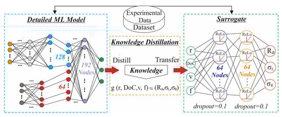 Even though the proposed architecture could effectively capture complex nonlinear dependencies between multimodal process signals and machining outcomes, it cannot provide explicit insight into the individual contributions of specific cutting parameters. Specifically, the direct use for performance enchantment or explainability is not feasible, since the predictive model requires time-series sensor streams as inputs, which are not available for hypothetical parameter combinations that were not physically examined. Accordingly, in order to facilitate both interpretability and optimization, a surrogate modeling strategy based on model distillation was adopted, as presented in Figure 5. This approach captures the prognostic behavior of the full multimodal ML model, while relying solely on input variables that are available for optimization and interpretation. In particular, the trained network was evaluated for each experiment across all time-series windows, and its projections were aggregated to obtain a single experiment-level forecast (Ra, σL, σR) that could reflect the behavior of the full-detailed model under that specific set of cutting parameters. These distilled predictions were then paired with the corresponding cutting parameters (r, DoC, v, f); forming that way a dataset in which each input vector consists solely of the controllable machining parameters and each target vector represents the aggregated response predicted by the ML model. However, it must be noted that while segmenting the time-series data yields a large number of learning instances for the deep multimodal model, it does not increase the number of distinct controllable parameter configurations. Hereupon, the surrogate (trained on experiment-level distilled outputs) learns from a modest number of unique parameter combinations, which is sufficient for trend-level interpretability but may limit fine-scale characterization of interactions and nonlinearities. Nevertheless, despite not requiring sensor data at inference time, the surrogate model still preserves the learned relationships between cutting parameters and the corresponding surface integrity responses. This behavior makes the distilled model suitable for parameter optimization, sensitivity analysis and multi-objective search. Consequently, a parametric surrogate model was employed in order to approximate the mapping established by the detailed multimodal network.