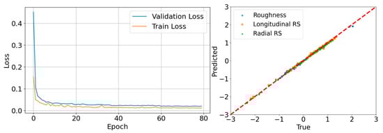 Regarding the training, the dataset was randomly shuffled and split into training (80%) and validation (20%) subsets to ensure reproducible results. This approach allowed the network to generalize patterns that occur repeatedly across different experiments rather than memorizing specific conditions. Consequently, each training and validation sample corresponded to a single one-second window of the process; containing both the dynamic sensor information, as well as the associated static features. The training was performed in a supervised manner using mini-batch gradient descent with the Adam optimizer, the initial learning rate was set to 10−3 and weight decay regularization (10−4) was applied to prevent overfitting. Moreover, a weighted mean squared error (MSE) loss function was applied to the standardized output variables. All weights were initially set to one, thereby assigning equal importance to the three outputs, though the formulation allowed for reweighting if necessary. The learning rate was dynamically adjusted using a “Reduce on Plateau” scheduler, which halved the learning rate when the validation loss stopped improving for several epochs. It should also be noted that model training incorporated an early stopping criterion, whereby validation loss was continuously monitored and the training was terminated after a predefined patience period without improvement. Therefore, the combination of adaptive learning rate scheduling coupled with early termination ensured stable convergence and prevented overfitting on the training phase. Notably, all the experiments were implemented in Python (v 3.10.19) using PyTorch (v 2.5.1) and trained on an NVIDIA GeForce RTX 3060 GPU with 12 GB of dedicated memory, where the total end-to-end preprocessing and training time was approximately one hour.