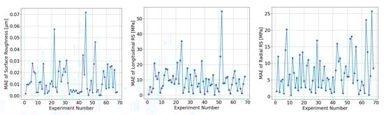 Following the training phase, the ML model was deployed to generate predictions for all the available experimental data. For each experiment, every one-second chunk was loaded sequentially, normalized and passed through the trained network to obtain the predicted values for surface roughness and residual stresses in the normalized output space. Although the estimations were produced at the per-chunk level, the final assessment of model performance was carried out at the experiment level in order to match the available ground-truth measurements. In particular, for each experiment, the forecasted outputs (Ra, σL, σR) from all chunks were averaged to produce a single set of mean predictions and then compared against the experimentally measured ones. Hence, the efficiency of the model was quantified using the Mean Absolute Error (MAE), providing an overall measure of the average prediction error. Figure 7 displays the forecast accuracy of the proposed multimodal ML model across all the investigated parameter configurations. Namely, the left subplot reports the MAE between the estimated and measured surface roughness, while the middle and right subplots exhibit the corresponding values for the longitudinal residual stress and the radial residual stress, respectively. Notably, the majority of experiments present low errors, indicating good prognostic capability of the model across the explored design space. However, a limited number of experiments manifest relatively higher MAE values, suggesting that specific combinations of cutting conditions or dynamic signal characteristics are more challenging to generalize, potentially due to measurement noise or reduced representativeness in the training set.
