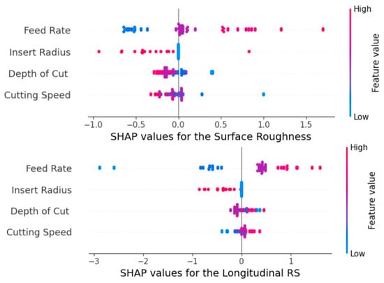Interpretability was achieved through the SHAP analysis, which offers a quantitative and rigorous assessment of feature importance. In particular, the SHAP framework interpreted the surrogate’s prediction by decomposing it into additive contributions from each feature. For the three target outputs (Ra, σL, σR), SHAP decomposed the model’s forecast into a starting baseline, to which the individual influence (positive or negative) of each turning parameter is added. Therefore, by decomposing each estimation into additive feature contributions relative to a baseline, the employed analysis supports both local explanation of individual machining conditions and global assessment of feature influence across the experimental domain.