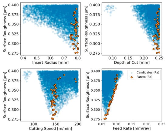 Regarding the investigation of the surface finish enhancement, Figure 12 depicts how the Pareto-optimal solutions emerge relative to the full population of candidates evaluated by the surrogate model. In each plot, the blue markers represent all feasible combinations that satisfy the imposed thresholds on roughness and combined residual stress, while the orange markers denote the subset that form the Pareto front, meaning that no other feasible point provides a simultaneous improvement in both objectives. The relationship between insert radius and surface quality shows a clear trend in the top left plot, where larger radius yields lower roughness values as suggested in the study [30], with the Pareto-optimal points concentrated exclusively at the upper limit of the allowed range. In the top right plot, a similar pattern is observed for the depth of cut, where increased depths consistently decrease surface roughness across the feasible region [31], and all Pareto-optimal points cluster near the maximum allowable depth. Lower depths are uniformly suboptimal, as they do not yield competitive surface quality and do not provide offsetting reduction in residual stresses.