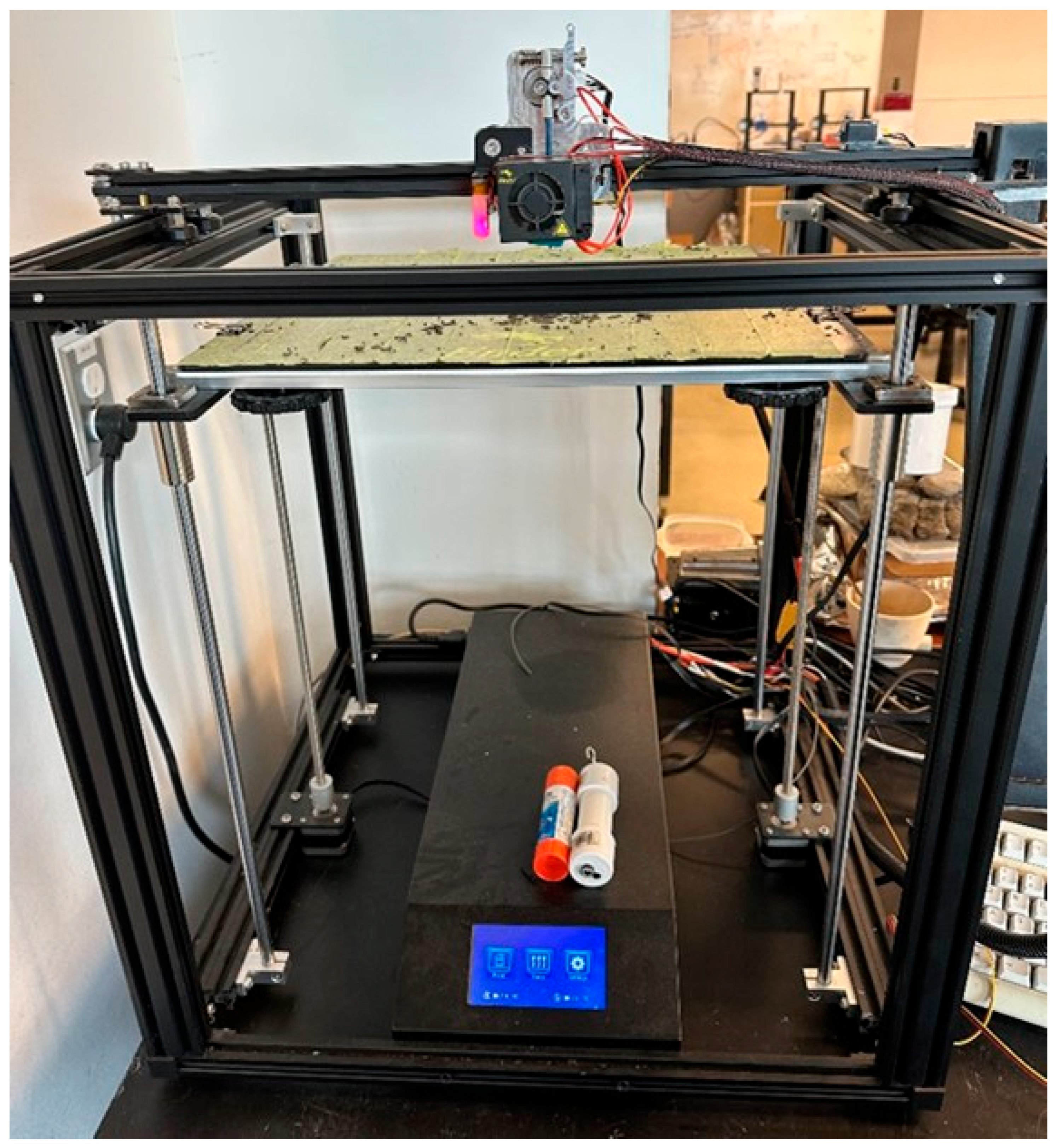 White cast iron filament was printed using a Creality Ender 5 Plus 3D printer (Creality, Shenzhen, China) with a MicroSwiss direct drive system and a 1.0 mm hardened steel nozzle, as shown in Figure 1. The material is a 1.75 mm diameter high-carbon (cast iron) Filamet™ produced by The Virtual Foundry (Stoughton, WI, USA), which had 79.1 percent metal powder by weight.