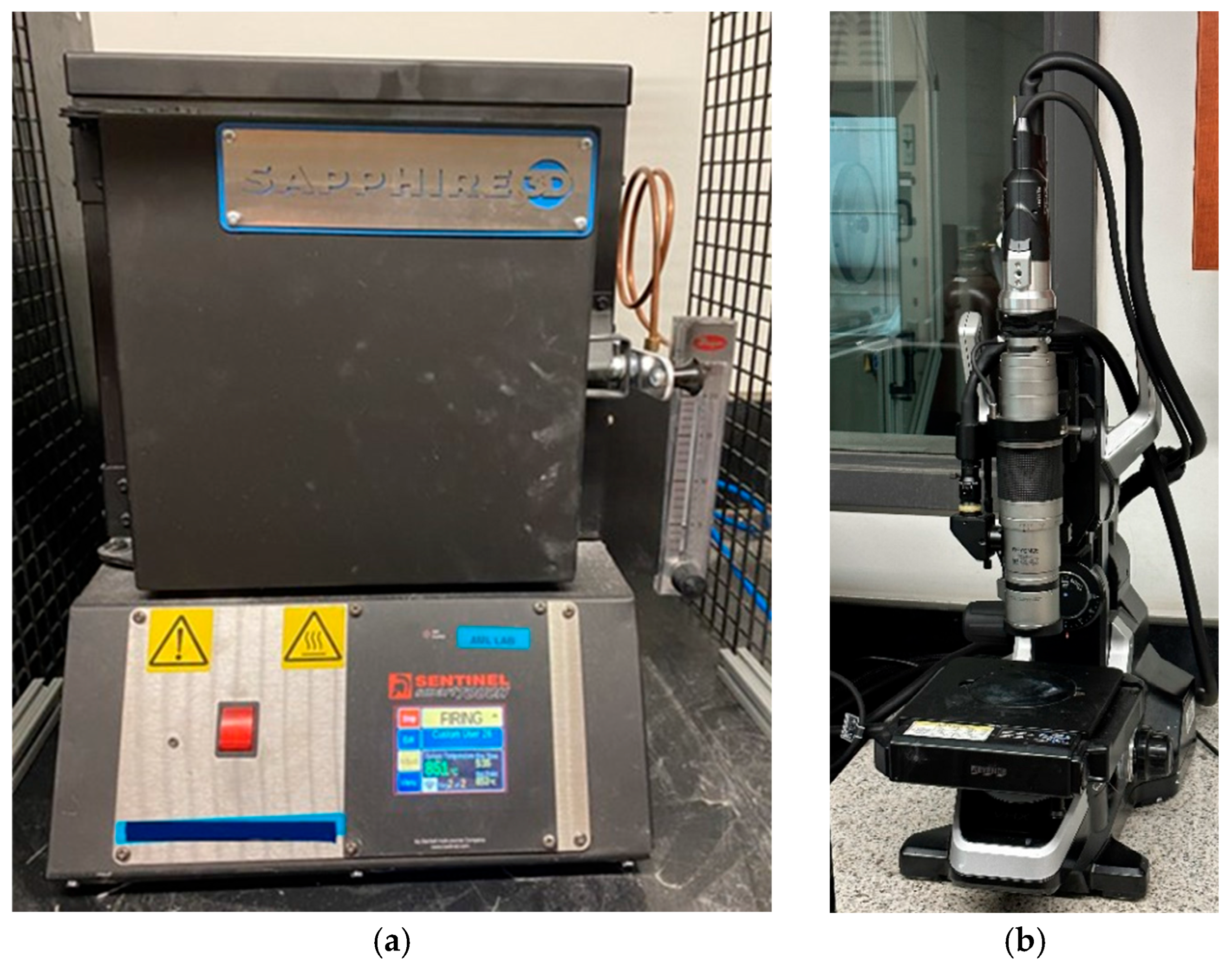 As shown in Figure 2a, debinding and sintering were completed in a Paragon kiln with a maximum sintering temperature of 1370 °C. Samples were placed in a 500 mL alumina crucible with steel sintering ballast, which holds the sample’s shape. Sintering carbon was laid on top of the sintering carbon to prevent oxidation of both the ballast and samples. The VHX series digital microscope (Keyence Canada Inc., Mississauga, ON, Canada) shown in Figure 2b was utilized to examine the porosity and microstructure of the sintered cast iron samples. The average microhardness was measured in 3 different locations to the ASTM E384 standard [15] using a dwell time of 10 s and a force load of 300 gf.