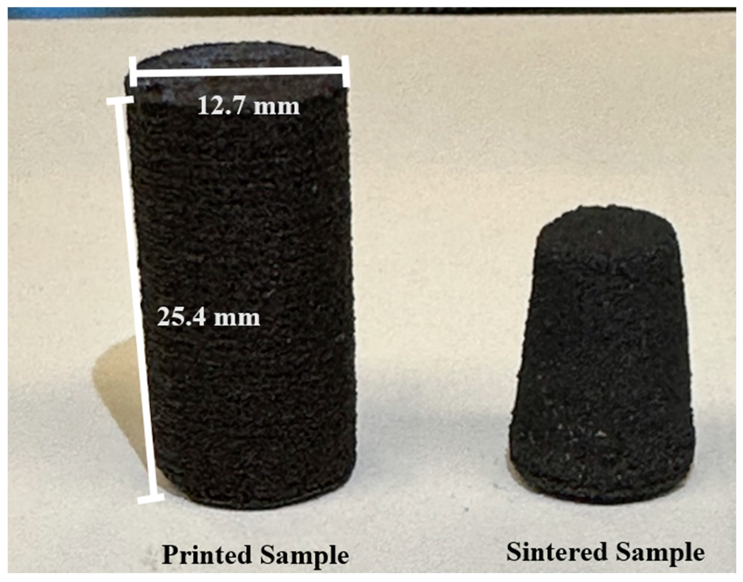 For printing, cylindrical samples were printed in accordance with ASTM International E9 standard [16], with an average measured diameter of 12.7 mm and an average measured height of 25.4 mm, as shown in Figure 3. The sample height and diameter are measured using digital calipers and mass measured using a digital scale. Density was calculated using the Archimedean method, comparing the measured volume to the measured mass. Based on previous research, samples were printed using specific parameters, 185% flow rate, 100% infill density, 0.20 mm layer height, 215 °C nozzle temperature, and a 45 °C bed temperature [17].