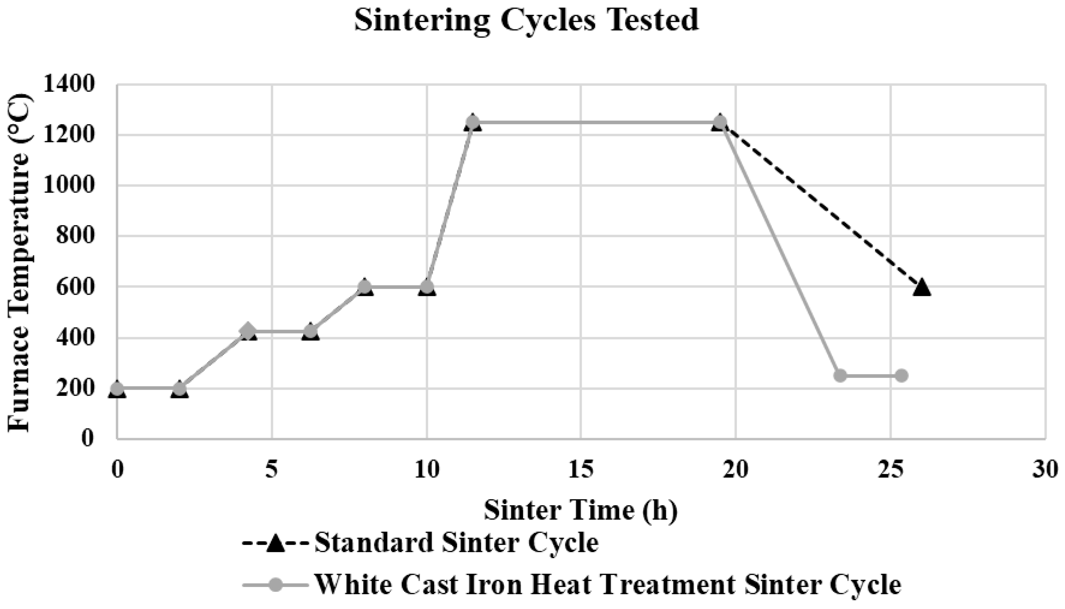 Once a peak sintering temperature and a dwell time yielding acceptable results were established, a comparison could be made between the cooling rates. Typically, cast iron goes through many heat treatment processes, with stress relief commonly the only in-process heat treatment process applied to white cast iron [19]. Stress relief helps ease residual stresses in complex and changing geometries during the casting process. Although this study did not investigate the residual stresses or any samples with complex geometries, a comparison was still completed to study the effects of stress relief heat treatment on the microstructures and mechanical properties [20]. Stress relief was applied as a comparison of the effect of an increased cooling rate compared to the standard recommended by The Virtual Foundry. Stress relief for cast iron consists of cooling the sample from the peak sintering temperature at a rate of 260 °C/h until it reaches 250 °C, which is then held for two hours [19]. This would be a cooling rate approximately 2.3-times quicker than the standard MEX/M cooling process. The complete design of the experiments can be seen in Table 2.