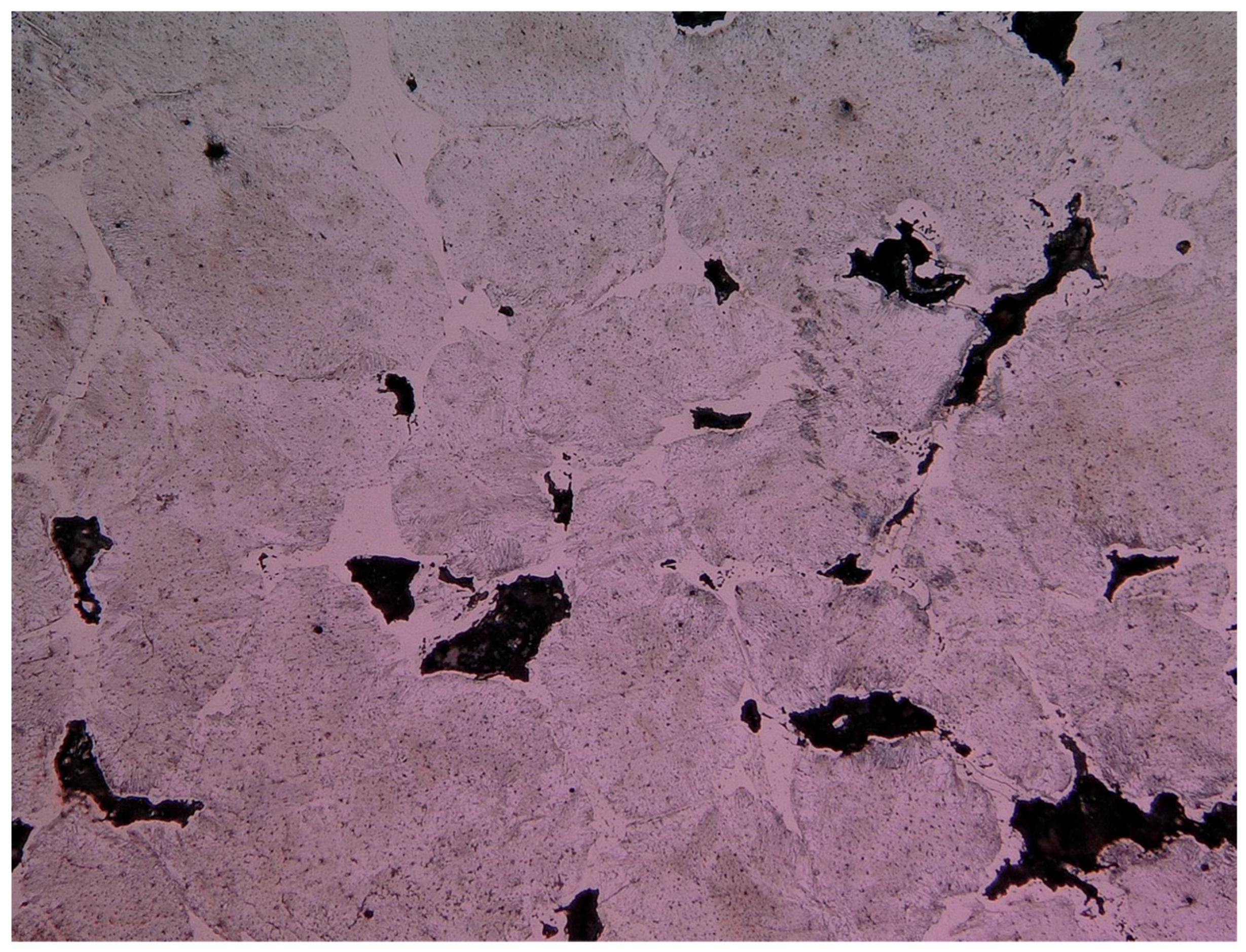 12258STD15.8Major scattered porosity with a crack through the center of the sample.Ledeburite throughout the cementite with course pearlite grains.White Cast Iron