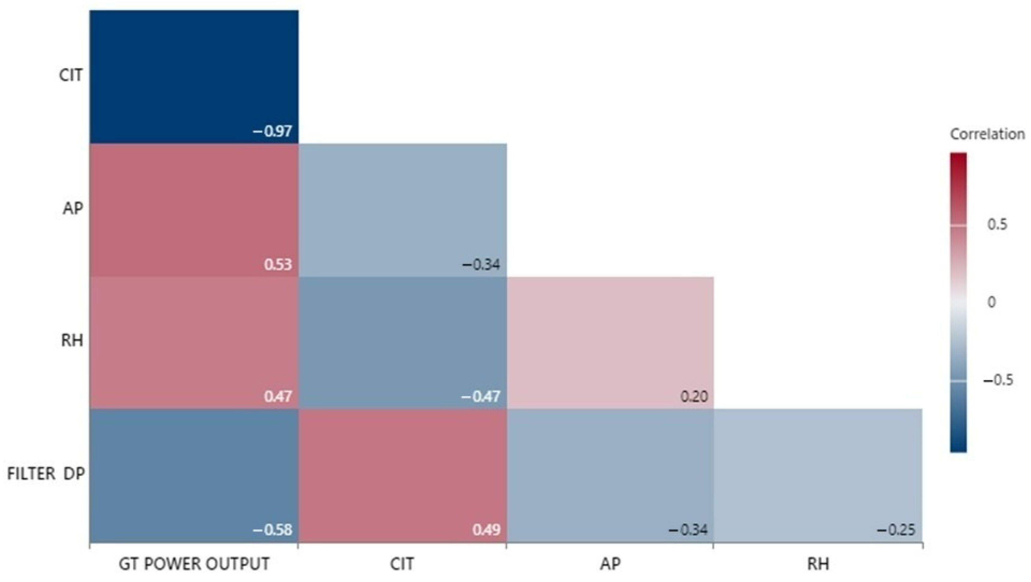 Figure 7 illustrates the correlation relationships among the key variables affecting gas turbine performance. The correlation coefficients reflect the direction and strength of the linear relationships between the variables. Accordingly, there is a strong negative correlation between CIT and GT Power Output (−0.97), indicating that power output decreases as the inlet temperature increases. AP has a positive effect on GT Power Output (0.53), meaning that power generation increases with rising pressure. A correlation of 0.47 indicates that RH and GT Power Output exhibit a moderately positive linkage, implying that higher humidity marginally enhances output. A negative correlation (−0.58) was also observed between Filter DP and GT Power Output, showing that turbine performance declines as filter fouling increases. These correlation analyses reveal the complex interdependencies among the environmental and operational variables affecting gas turbine performance and indicate that CIT and filter fouling play a particularly decisive role in determining GT Power Output. These findings support the necessity of prioritizing these variables in modeling and performance prediction processes.
