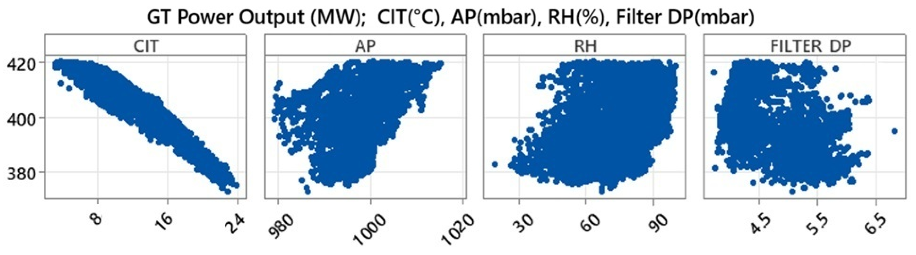 Figure 8 illustrates the relationships between GT Power Output and four key environmental and operational parameters—CIT, AP, RH, and Filter DP. All graphs are presented in scatter plot form, showing the influence of each parameter on GT Power Output. A clear negative correlation is observed between CIT and GT Power Output. As CIT increases—meaning as ambient temperature rises—the power generated by the turbine decreases. This phenomenon can be attributed to the fact that higher inlet temperatures reduce air density, which in turn diminishes the mass flow supplied to the compressor and negatively affects combustion efficiency. Consequently, the turbine produces higher power under lower temperature conditions. Changes in AP have a positive effect on GT Power Output. Higher atmospheric pressure increases air density, allowing more air mass to enter the compressor, which in turn enhances combustion efficiency and power generation. Therefore, during periods of elevated AP, GT Power Output shows a distinct increasing trend. RH shows a rather limited and unclear connection with GT Power Output, indicating that the influence of humidity is weak and not well defined. The data exhibit a generally homogeneous distribution without a clear trend, indicating that RH, although it may influence power output indirectly, is not as decisive a parameter as CIT or AP. For Filter DP, a negative trend is evident with GT Power Output. The increase in pressure drop due to accumulated dirt or particulates in the filters reduces the airflow entering the turbine, negatively affecting power generation. Overall, the figure clearly demonstrates the sensitivity of GT Power Output to environmental conditions. Among these, CIT, AP, and Filter DP are the most influential parameters affecting power output, while the effect of RH remains secondary.