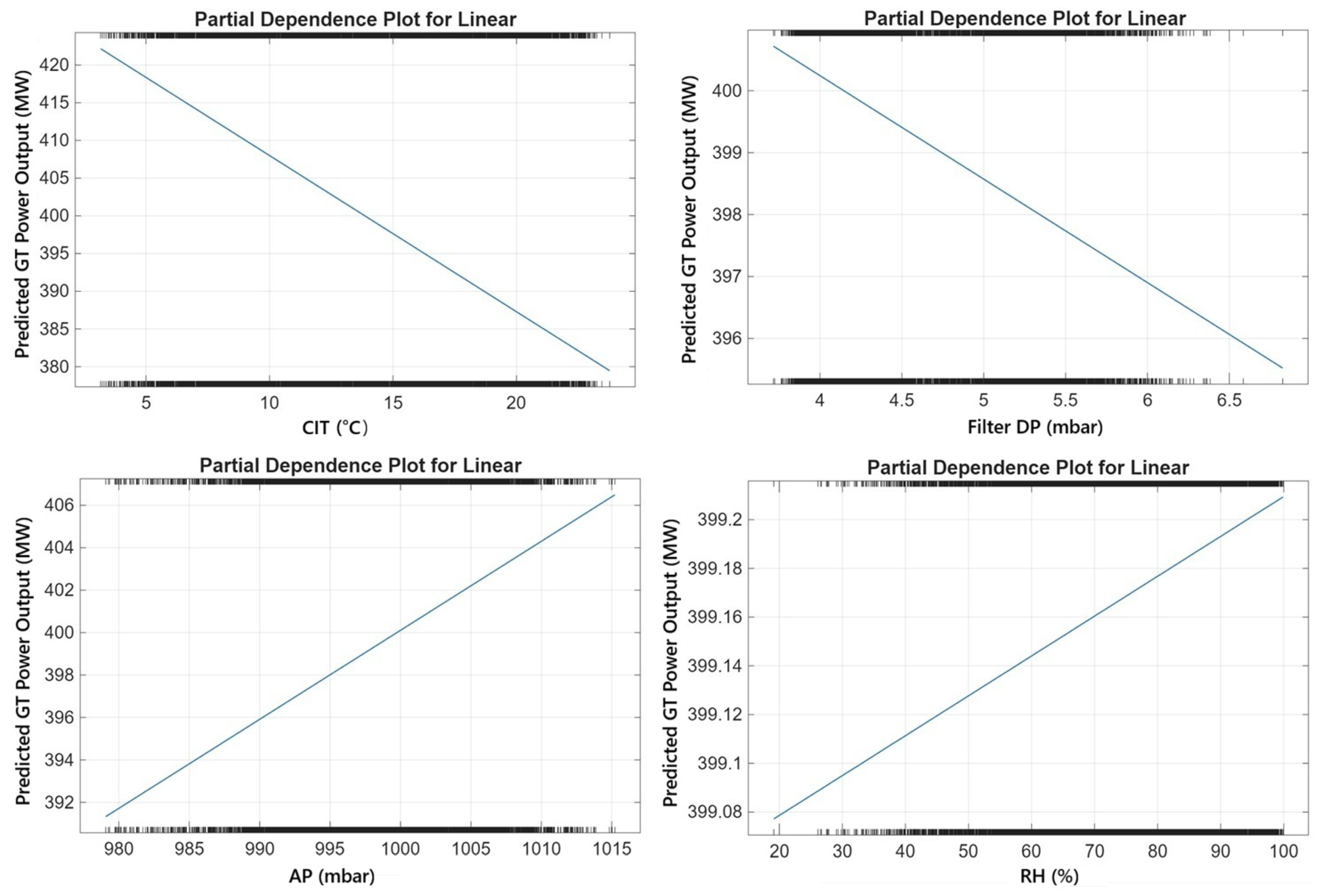 Figure 9 presents the partial dependence plots obtained from the MLR method, showing the individual effects of the main operating parameters (CIT, Filter DP, AP, and RH) on GT Power Output.