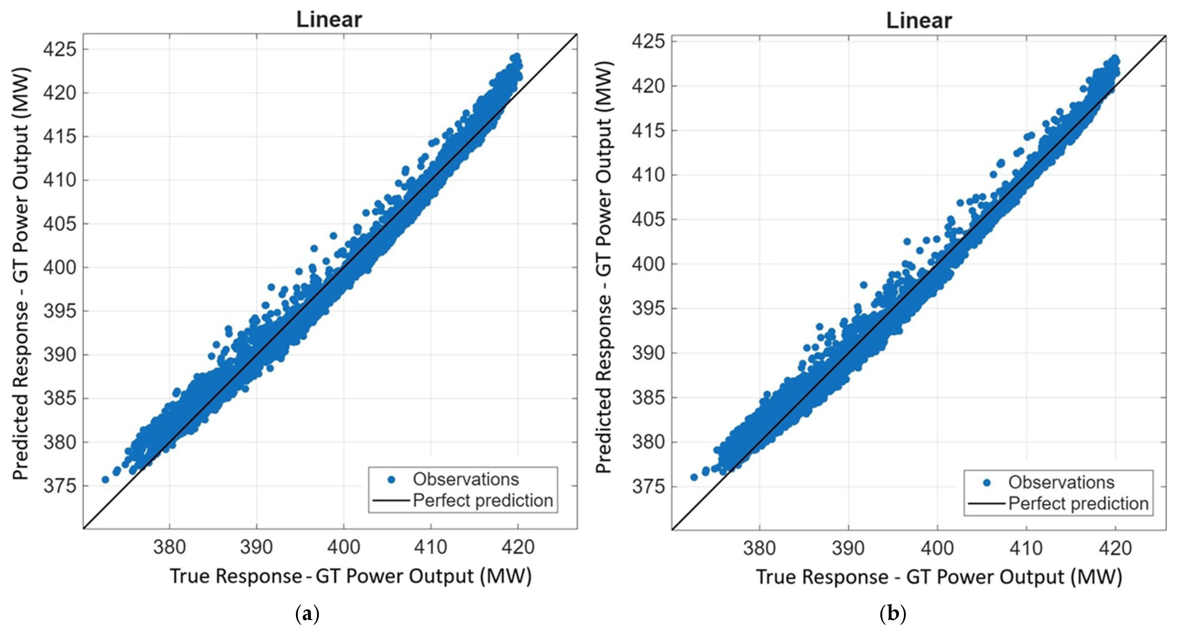 Figure 10 presents a comparative visualization of the MLR model’s performance in predicting GT Power Output, under two different conditions—before and after the inclusion of the Filter DP variable in the regression model. In both graphs, the horizontal axis represents the true (measured) values, while the vertical axis represents the predicted values generated by the model. The diagonal line on the plots denotes the ideal prediction line, where the predicted and actual values perfectly coincide. The closer the data points are distributed around this line, the higher the prediction accuracy of the model.