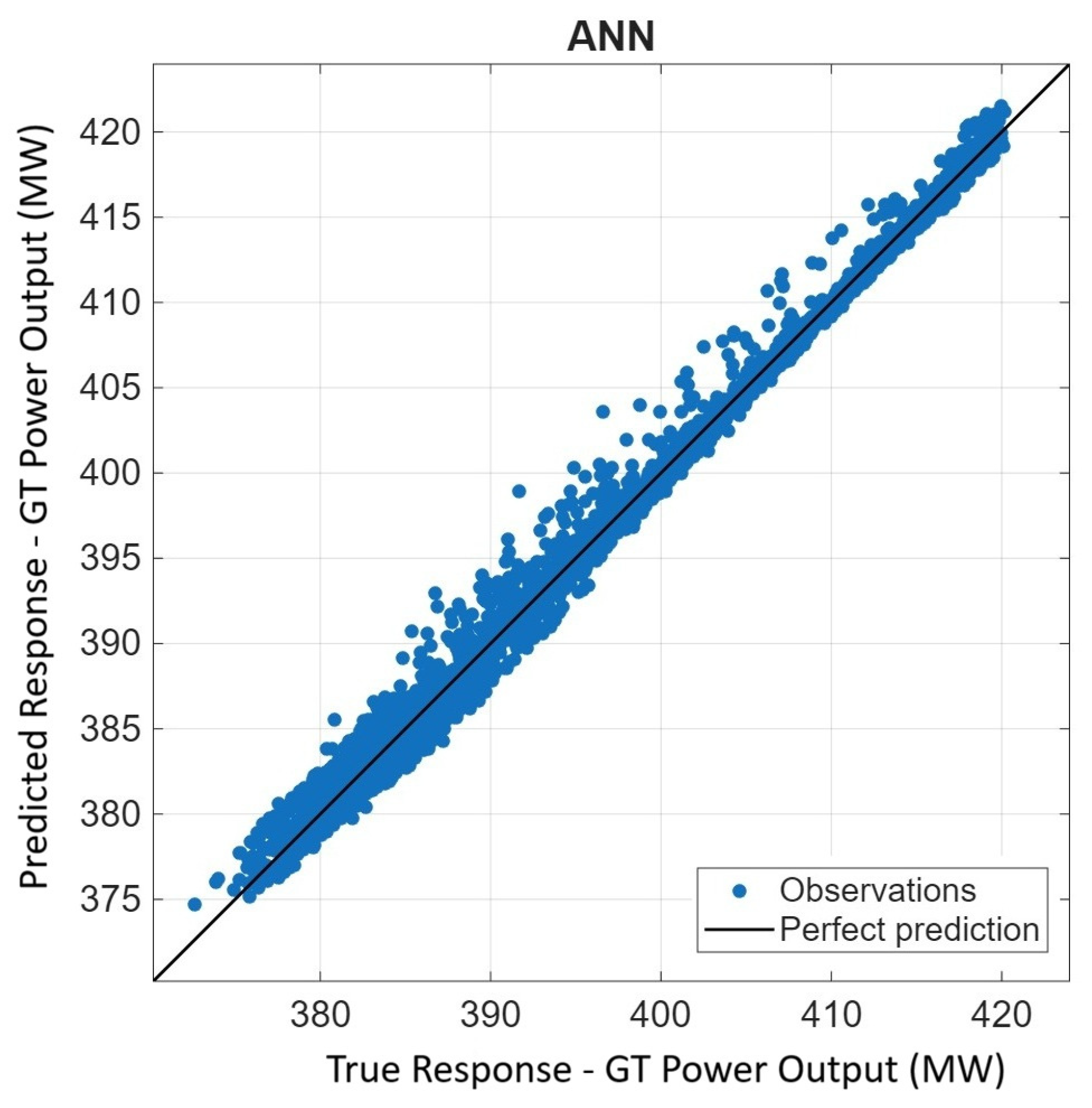 Figure 11 shows the correspondence between the ANN-based predictions and the actual operational data, confirming the model’s superior ability to capture the effects of AP, RH, CIT, and Filter DP on GT Power Output. The blue dots on the graph represent the model’s prediction results, while the black 45° diagonal line denotes the perfect prediction line. It can be observed that the majority of the data points are densely clustered around this reference line, indicating that the ANN model provides high-accuracy predictions with minimal systematic bias. The model’s predictions exhibit a strong linear correlation with the actual measurements, which is further supported by the high R