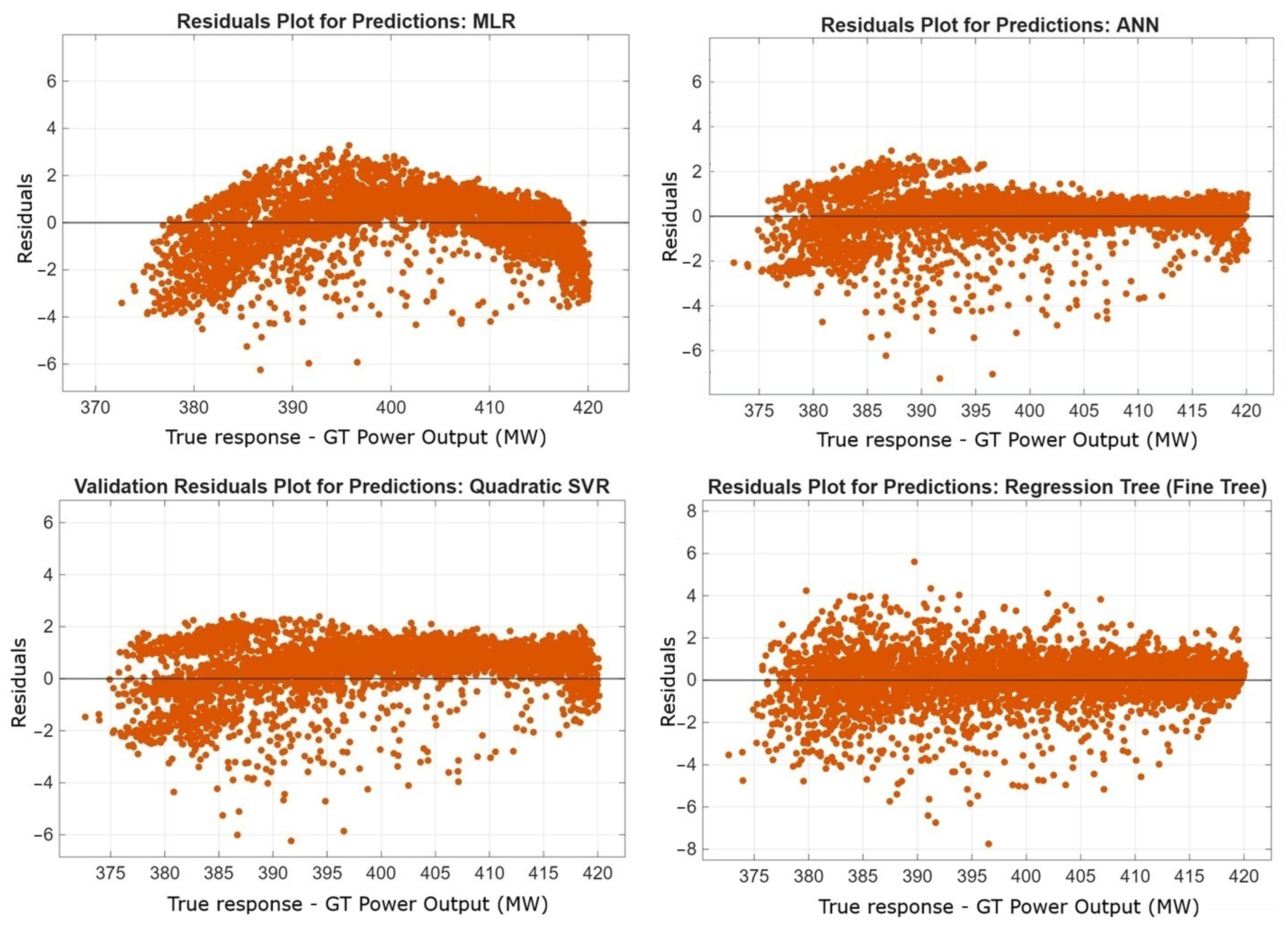 In the residual plot of the MLR model, the residuals are generally distributed regularly around the zero line, showing only a slight curvature trend. This indicates that the model captures the relationships between the variables quite accurately and demonstrates strong predictive performance. Examination of the residual values suggests that the MLR model produces stable and reliable results. In the ANN model, the concentration of residuals within a narrow range indicates that the model generates predictions with higher accuracy and lower error compared to other models. This result demonstrates that the ANN algorithm effectively learns the complex relationships between variables and represents the gas turbine power output in the most accurate manner. The Quadratic SVR algorithm successfully captures nonlinear relationships and provides stable and reliable predictions of GT Power Output. In the residual plot of the Fine Tree model, the data appear balanced around the zero line with no noticeable curvature or systematic bias. The fact that most of the model predictions fall within the ±2 MW range indicates that the errors are low and the prediction accuracy is high. These findings confirm that the Fine Tree algorithm effectively captures the nonlinear interactions among variables and reliably represents GT Power Output.