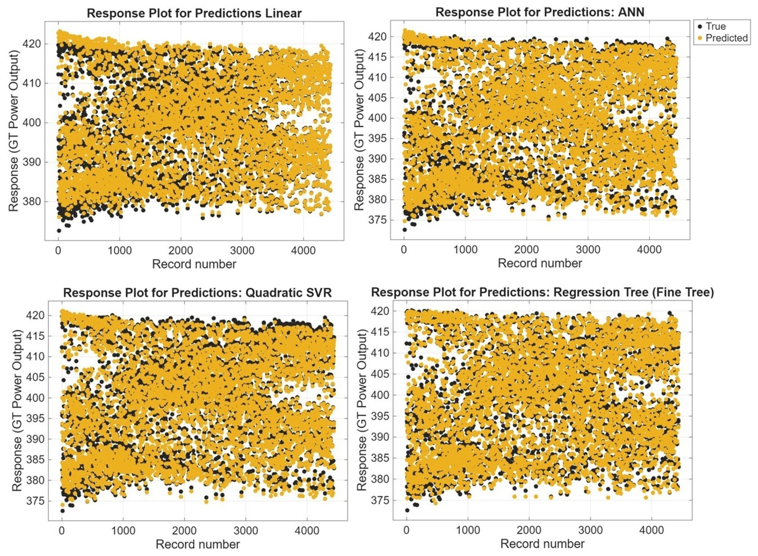 Figure 13 presents a comparative illustration of the GT Power Output prediction performance of the ML models (MLR, Fine Tree, Quadratic SVR, and ANN). In each graph, the black dots represent the measured (actual) GT Power Output values, while the yellow dots represent the predicted values generated by the models. The vertical axis indicates the GT Power Output, and the horizontal axis shows the data record number.