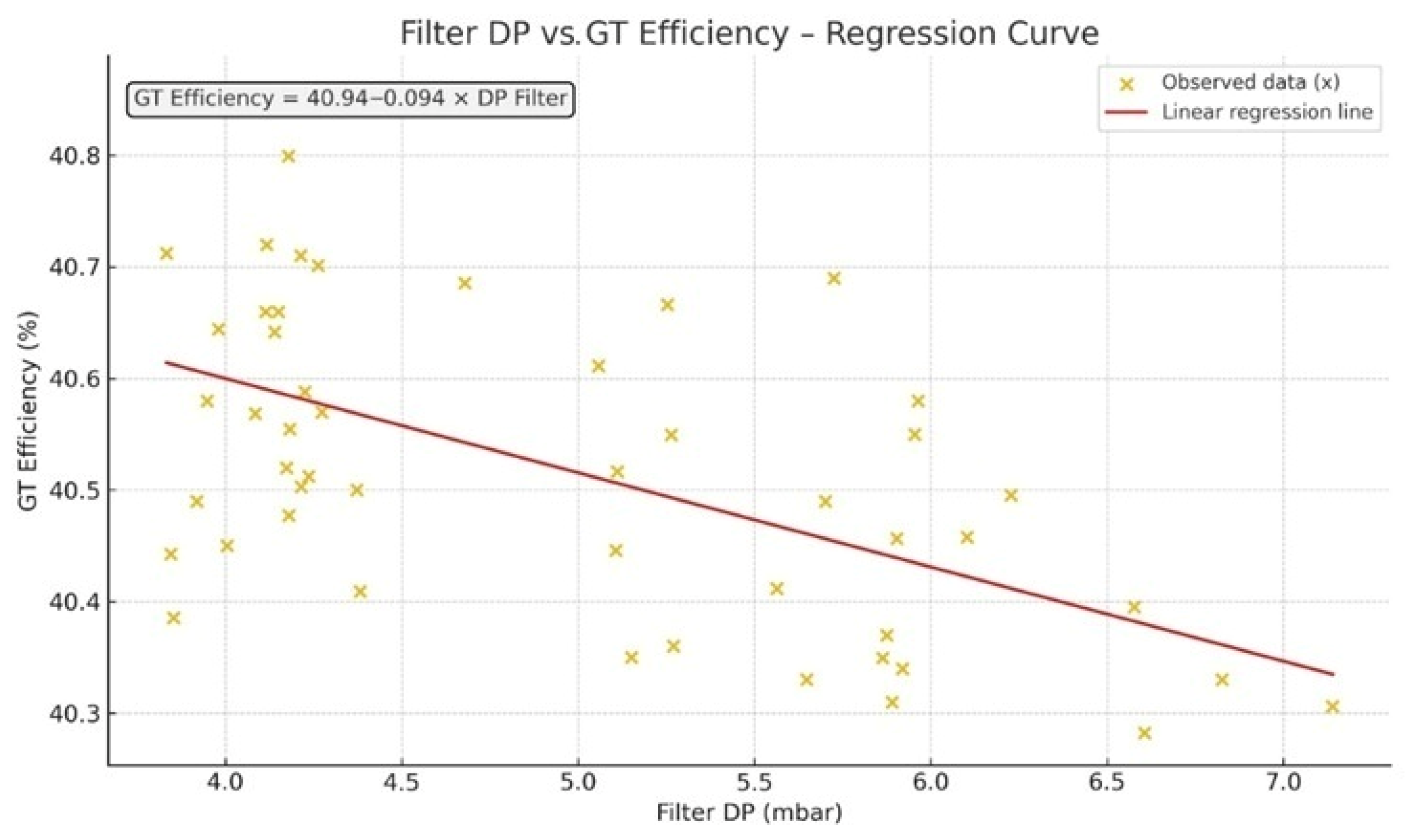 Figure 14 illustrates the linear relationship between the Filter DP and gas turbine efficiency. The yellow “×” markers represent observation points obtained from real operational data, while the red line denotes the linear regression fit. The negative slope of the regression line (−0.094%/mbar) indicates that gas turbine efficiency decreases linearly with increasing Filter DP values. Specifically, each 1 mbar increase in filter differential pressure results in approximately a 0.094% decrease in turbine efficiency. This trend clearly demonstrates the adverse impact of filter fouling on turbine performance and confirms that pressure losses occurring in the inlet air filtration system directly reduce the thermodynamic efficiency of the gas turbine.