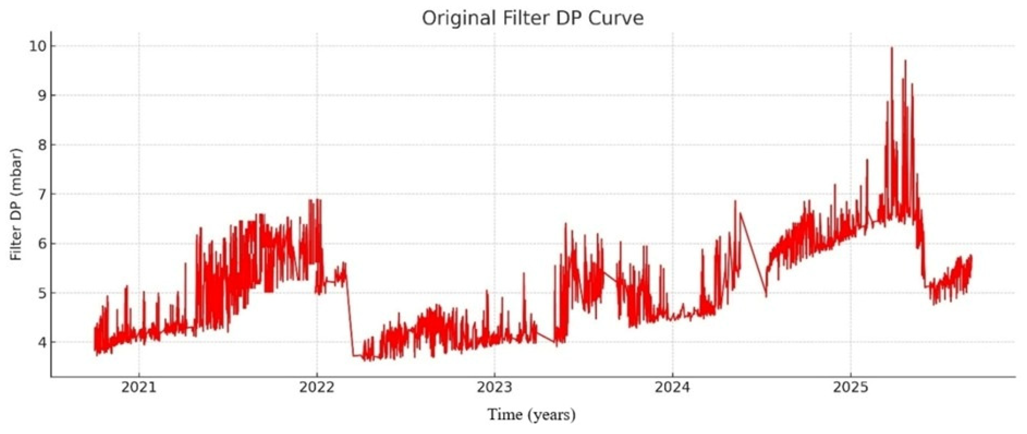 Overall, the figure clearly reflects the contamination–performance loss–replacement cycle of the filter and highlights the critical role of regular and holistic filter maintenance in sustaining turbine performance. In line with these findings, optimizing filter replacements within a condition-based maintenance framework is highly important—not only performing the change at the right time, but also ensuring that the appropriate filter stages are replaced together.
