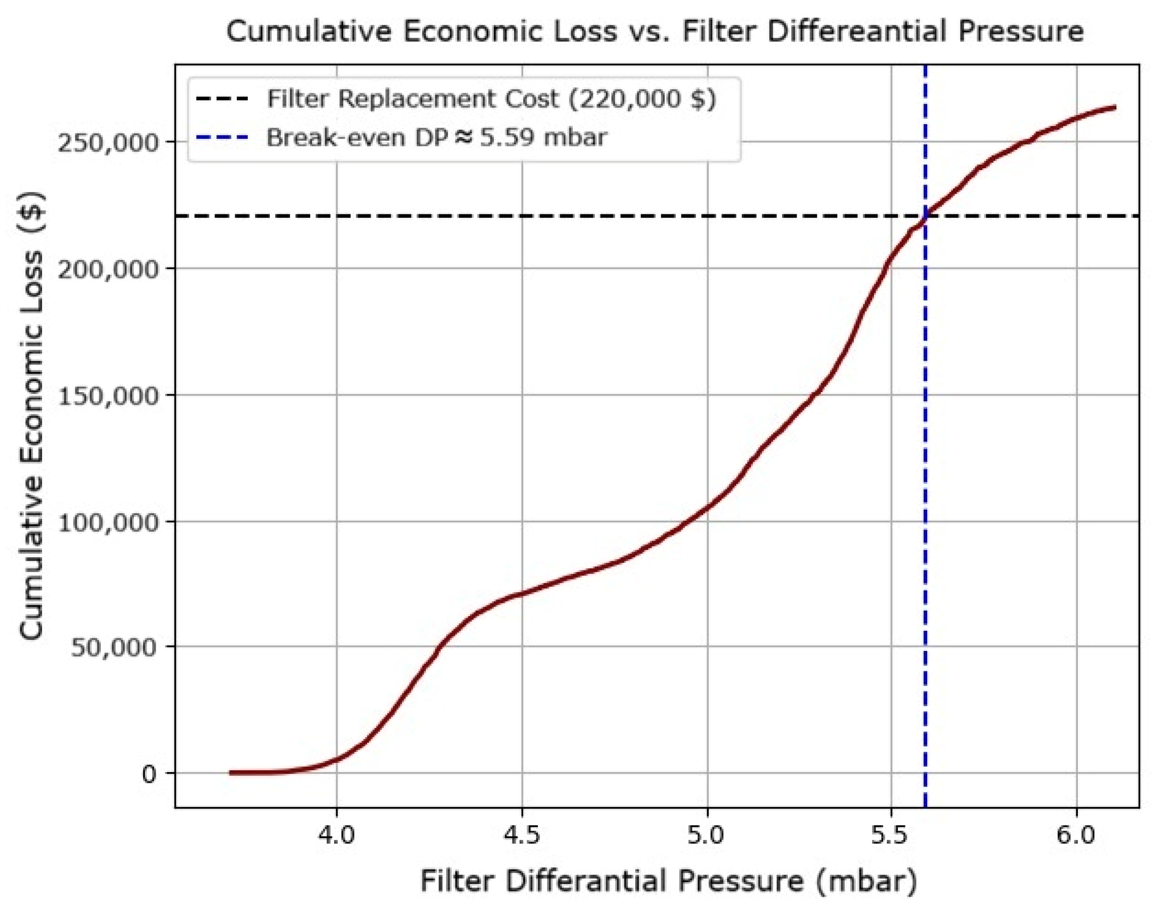 By evaluating the cumulative hourly economic losses over time, the analysis revealed that if the Filter DP reaches 5.6 mbar, the cumulative production and fuel losses would equal the total replacement cost of the three-stage filter system, which is 220,000 USD (