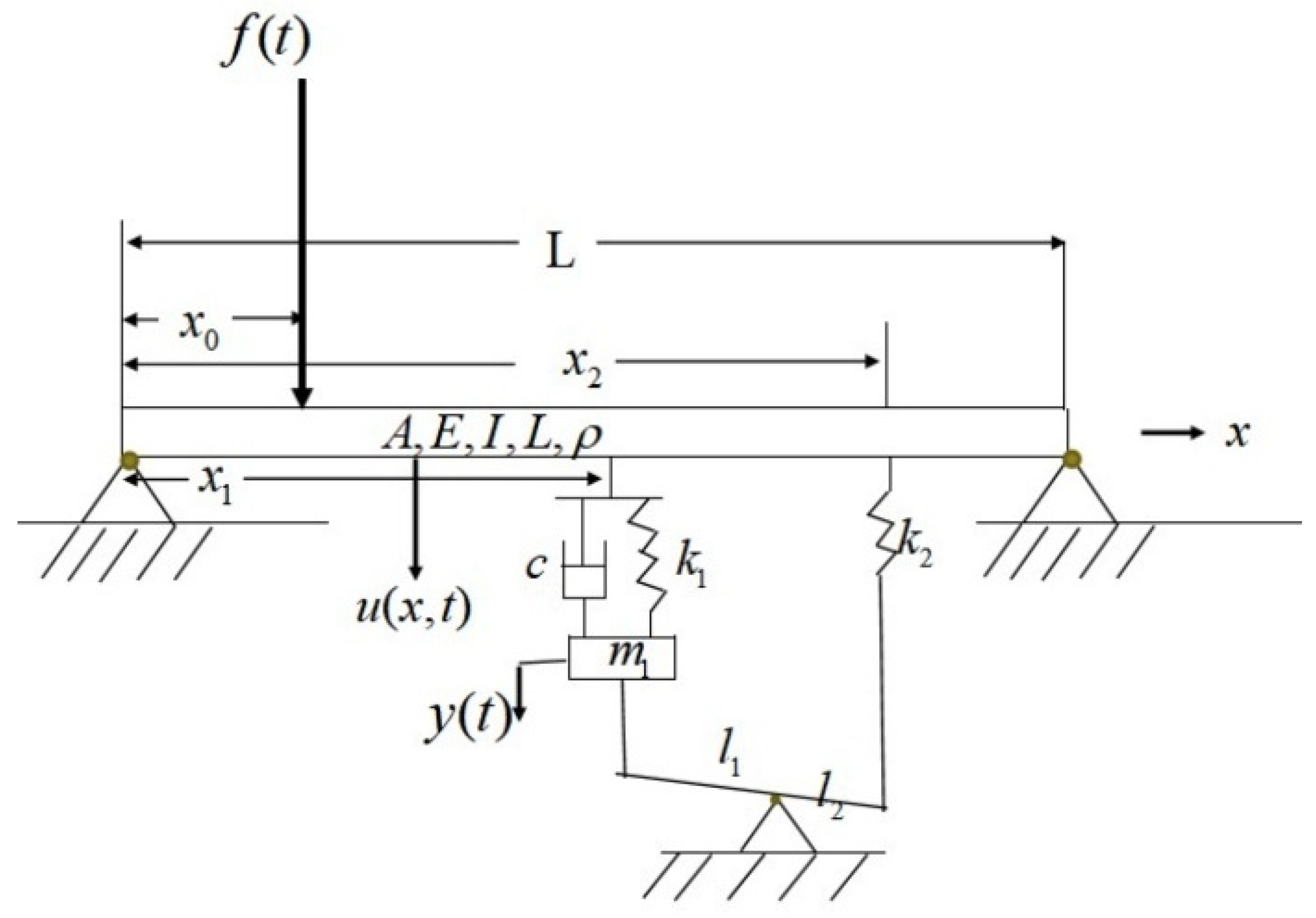 Consider a simply supported elastic beam with uniform cross-section, characterized by its length , cross-sectional area , Young’s modulus , density , and cross-sectional moment of inertia , giving a total mass of . A coordinate system is established with its origin at the left end of the beam. The longitudinal position along the beam is denoted by , and the transverse displacement is described by , representing the deflection of the beam at position and time . A concentrated harmonic force is applied at coordinate on the beam, where and are the amplitude and frequency of the external force, respectively.