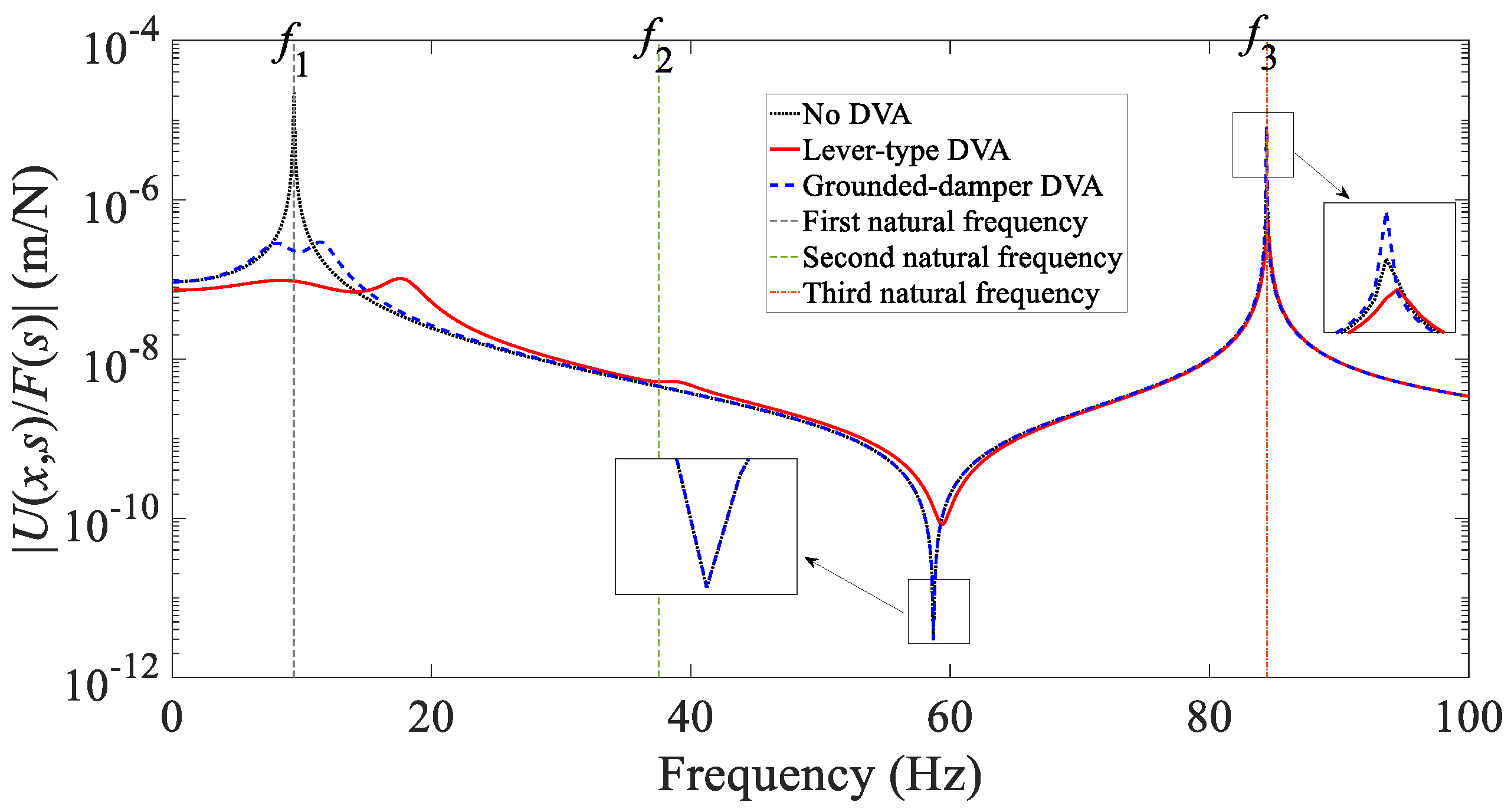 Figure 3. Results show that when considering the total response of the first ten modes, the proposed lever-type DVA suppresses the first-mode vibration more effectively than the grounded-damper DVA. The proposed design also offers useful attenuation for adjacent structural modes. By contrast, the grounded-damper DVA, which shares a similar grounding requirement, contributes little to the control of neighboring modes.