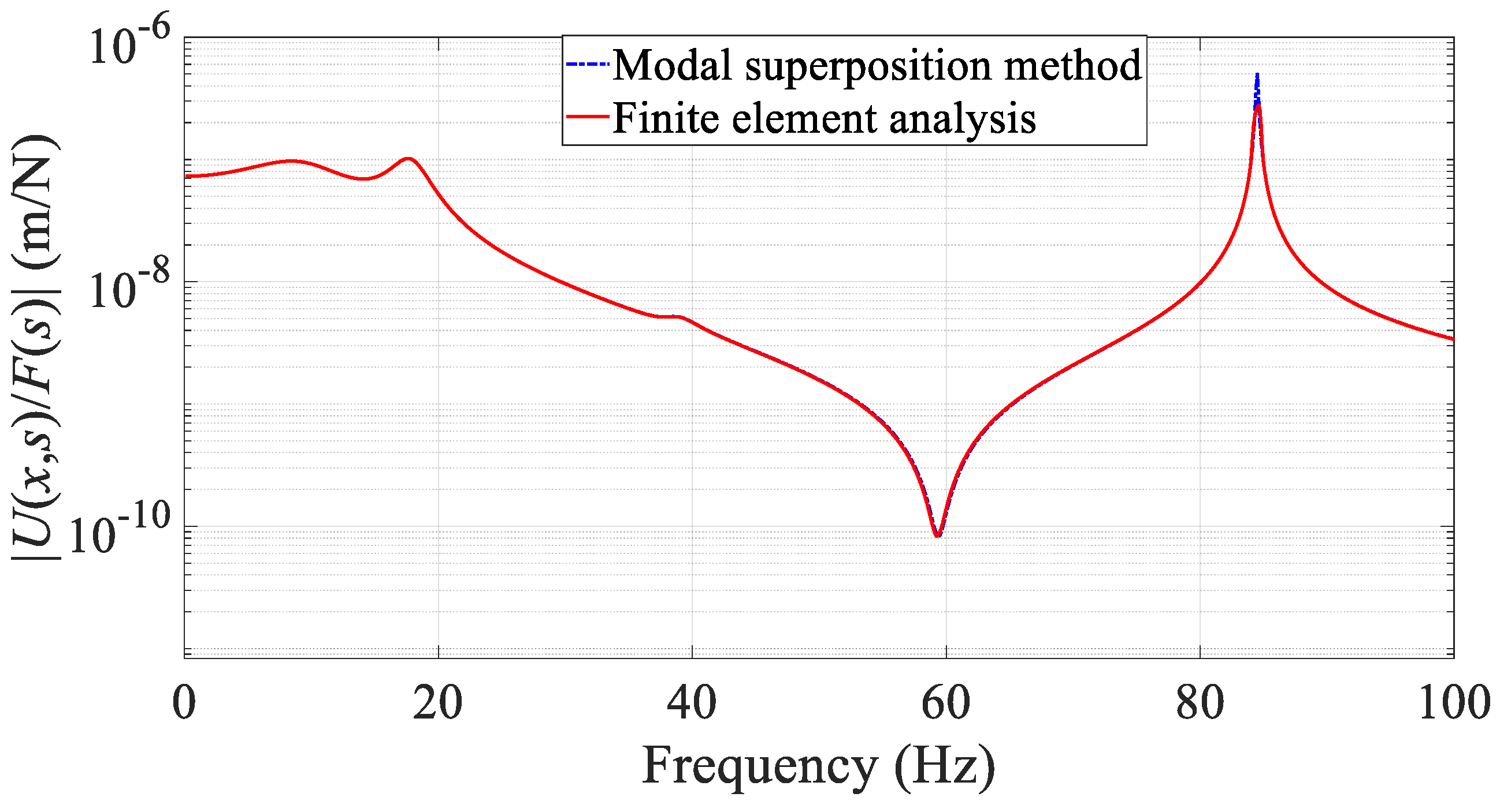 Figure 4, the frequency response curves obtained from the proposed theoretical method and the finite element model are in good agreement over the frequency range of interest, except for minor discrepancies at a few resonance peaks. This agreement confirms the validity of the H