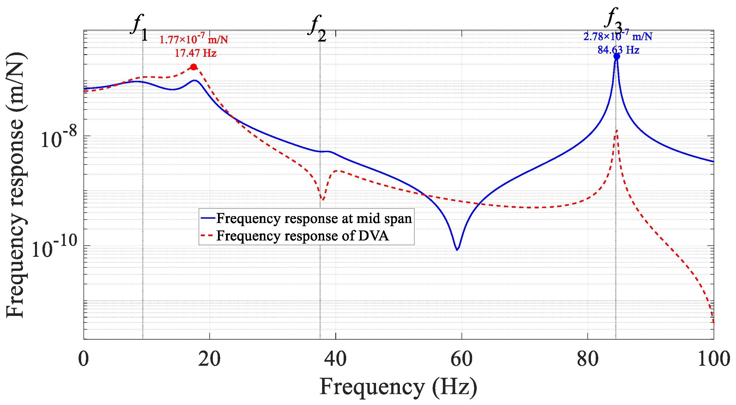 To show the efficiency of this optimization procedure of lever-type DVA on beam structures in vibration suppression, the numerical case studies are presented in this section. At first, vibration suppression performance of proposed design of DVA under harmonic force excitation is studied in comparison with traditional one, and then, the influence of lever position on vibration suppression performance is considered.