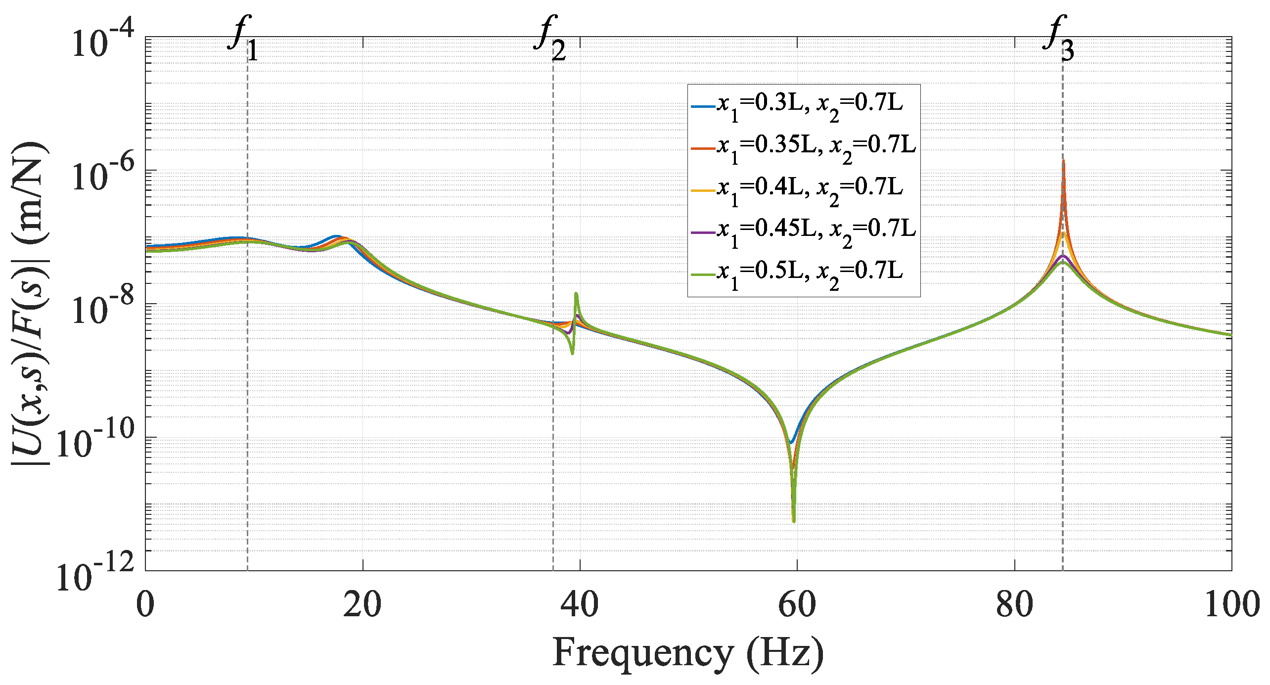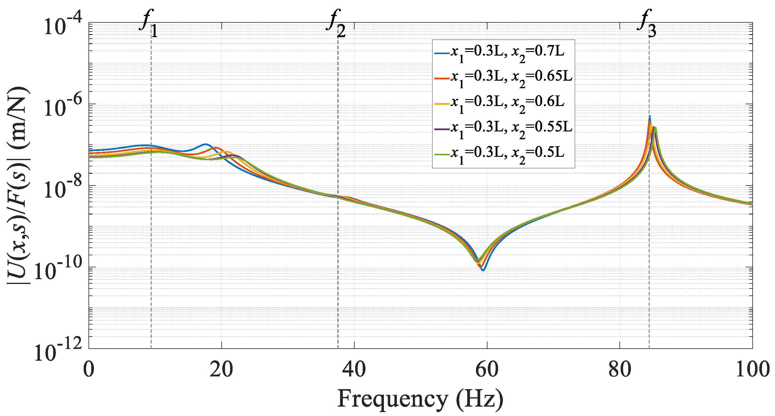Figure 6, as the left endpoint moves toward the mid-span, the original resonant peaks are reduced. The peak near the first natural frequency, which has already been suppressed by the DVA, shows only a slight decrease, whereas other resonant peaks, such as those around 60 Hz and 80 Hz, are noticeably lowered. Meanwhile, a new resonant peak emerges near 40 Hz (see the green curve), though its amplitude remains relatively low and does not significantly affect the overall vibration assessment. In summary, moving the left support of the lever closer to the mid-span leads to further attenuation of the structural vibration.
