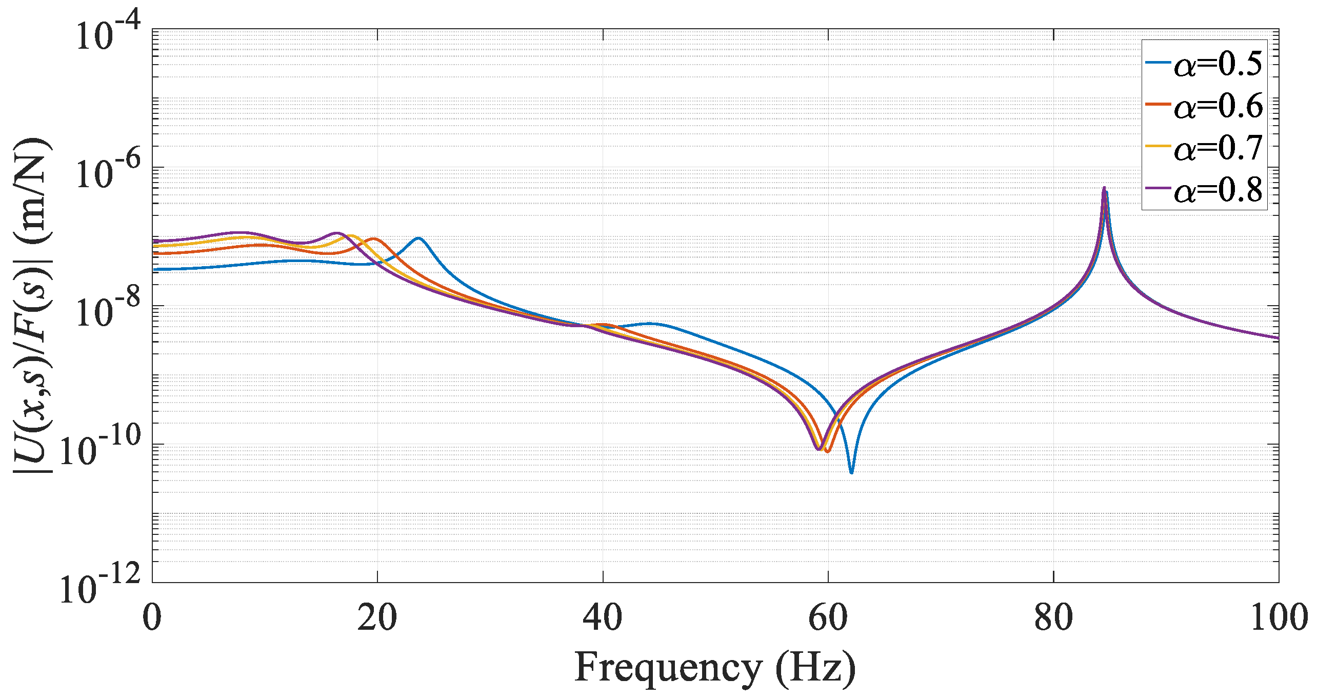 is the force distribution vector corresponding to the excitation location. Accordingly, the frequency response function between a unit harmonic force applied at a given degree of freedom and an arbitrary response quantity (e.g., the mid-span displacement of the beam) can be computed as