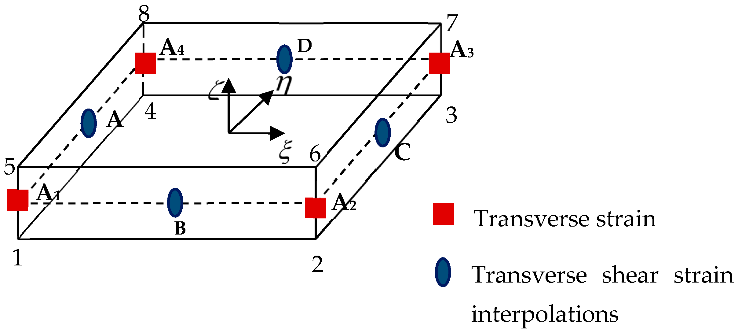 , the ANS method uses an evolution of the transverse shear strain at four collocation points on the reference surface, labeled
