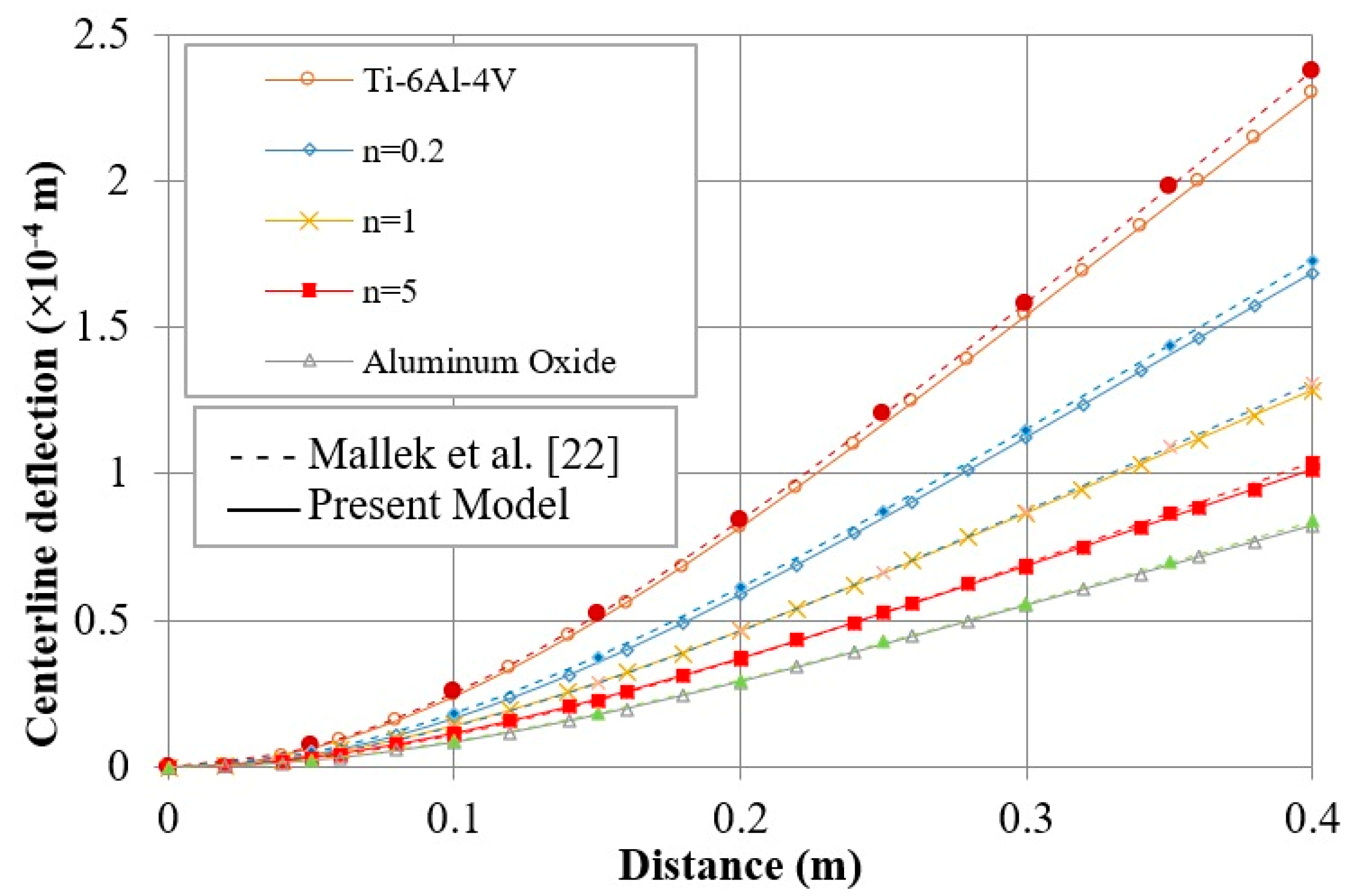 n passes from Aluminum oxide to Ti-6Al-4V. This can be explained by the high-bending stiffness of Aluminum oxide compared to Ti-6Al-4V.