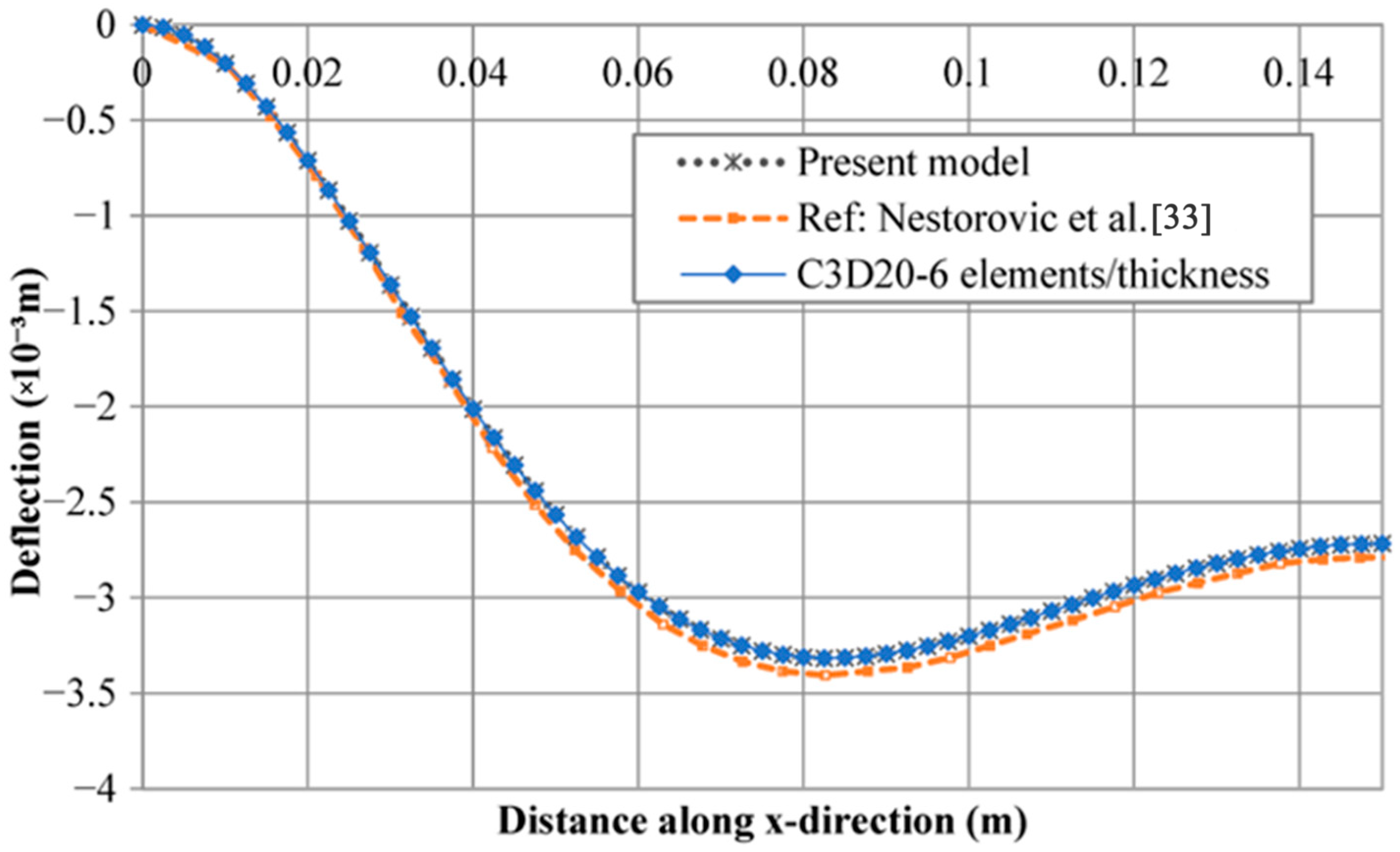 −4 m) is in close agreement with the result from the high-order quadratic reference element, ABAQUS C3D20 (3.897 × 10