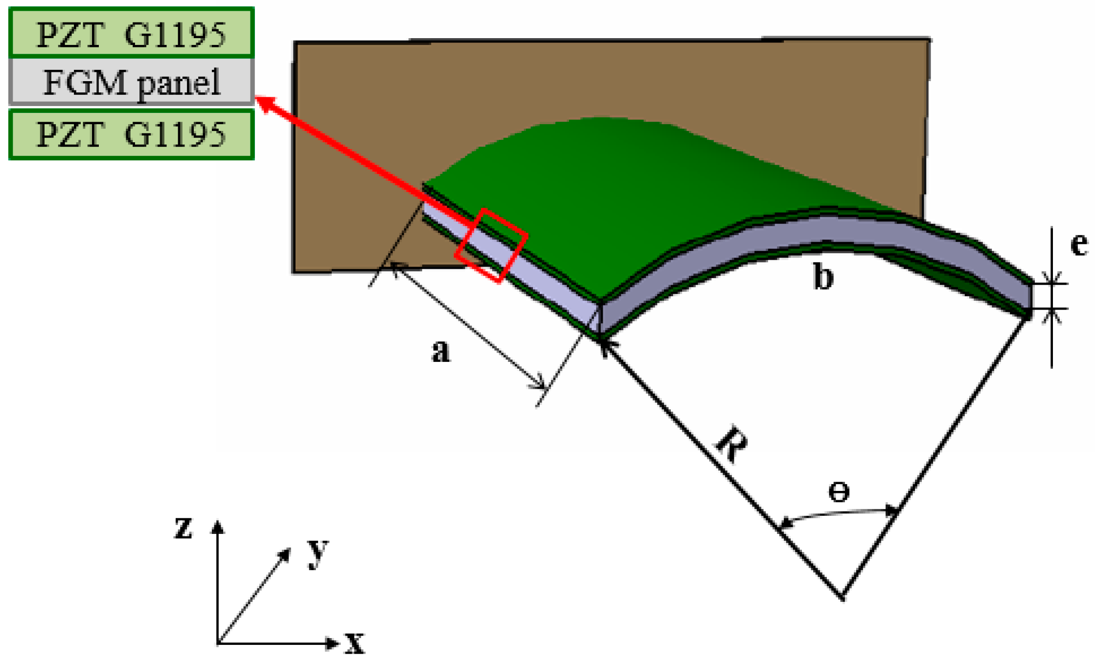 . The geometrical parameters of this model are defined as a = b = 254 mm, e = 0.5 mm, and a radius of undeformed mid-surface R = 2540 mm. The bonded piezoelectric patches are made from the PZT G1195 material already identified in