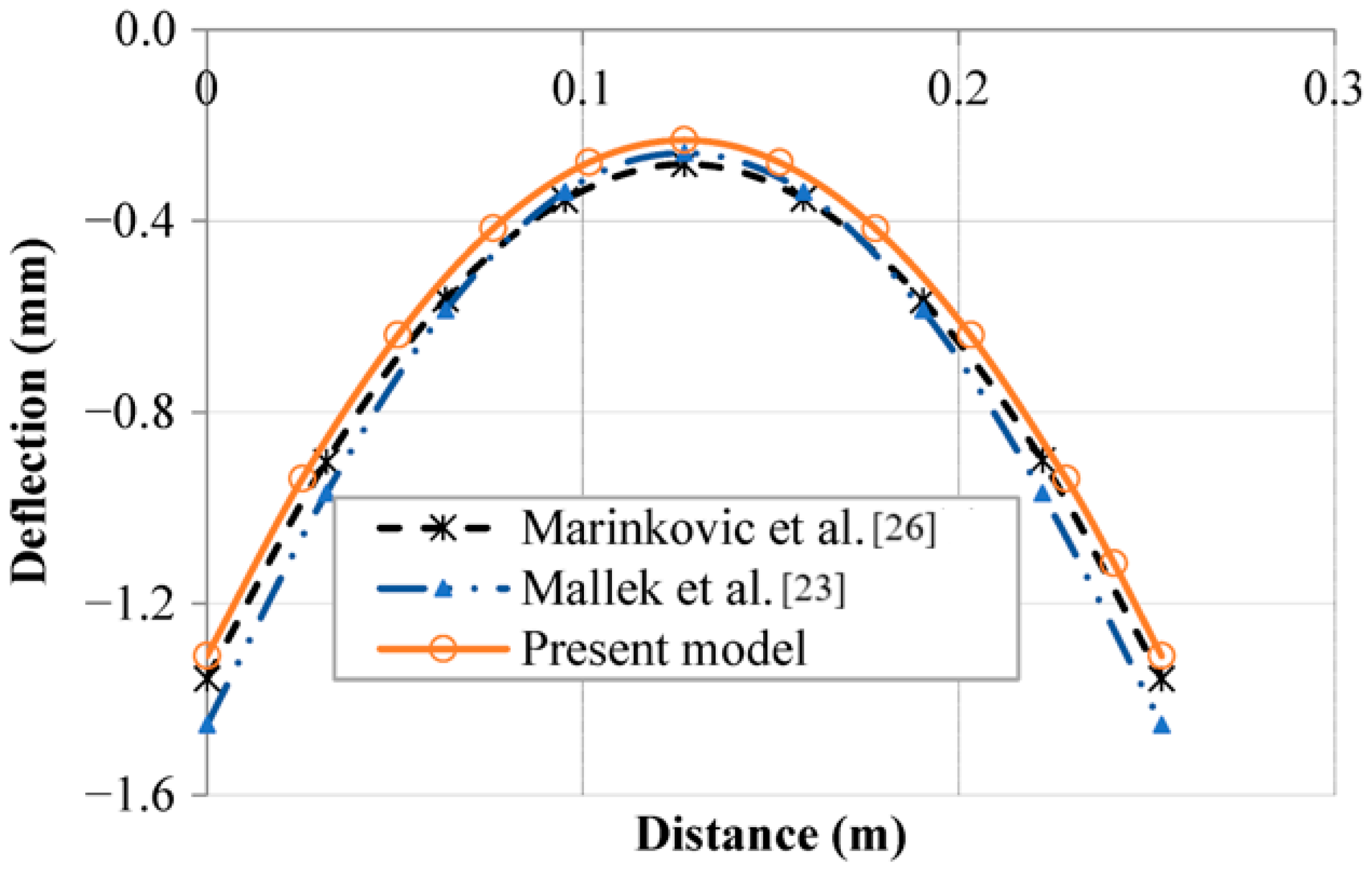 Figure 20 depicts the circumferential centerline deflection of a cylindrical panel structure under actuation load. It is obvious that the obtained results closely align with deflections presented in the abovementioned references. These observations underscore that the implemented solid-shell element can be used to conduct static analysis on the cylindrical panel. In such scenarios, the proposed model demonstrates its ability to overcome numerical locking issues in shaped structures with complex geometries.