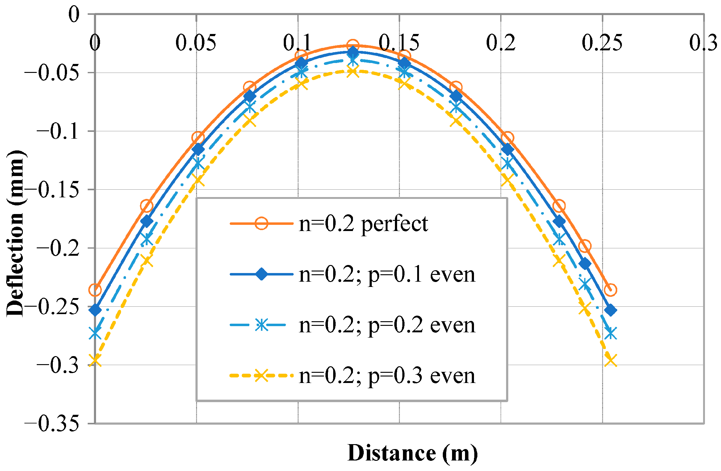 Figure 15 illustrates longitudinal deflections considering one quarter of the plate, y = 0, for a perfect FGM plate with four patches embedded for various power law index