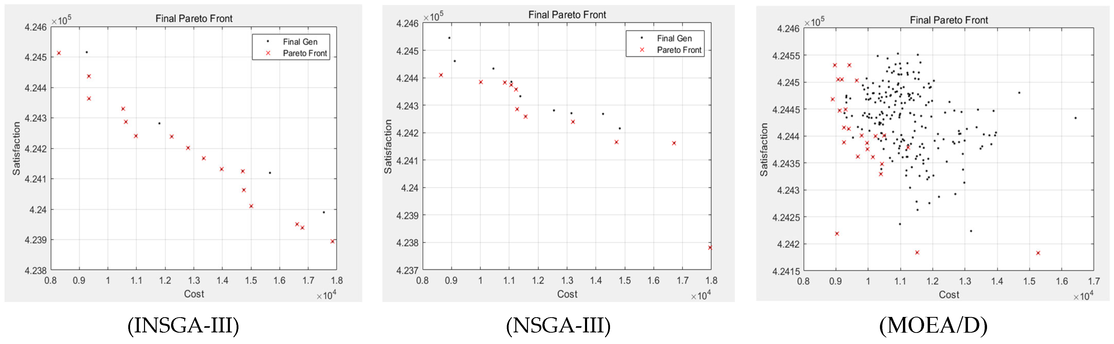 Figure 4, the “front” formed by the solution set obtained by INSGA-III is closest to the lower-left corner of the coordinate plot (i.e., the ideal region of lower cost and higher satisfaction), indicating that it possesses the strongest convergence capability and can discover higher-quality solutions closer to the true Pareto front.