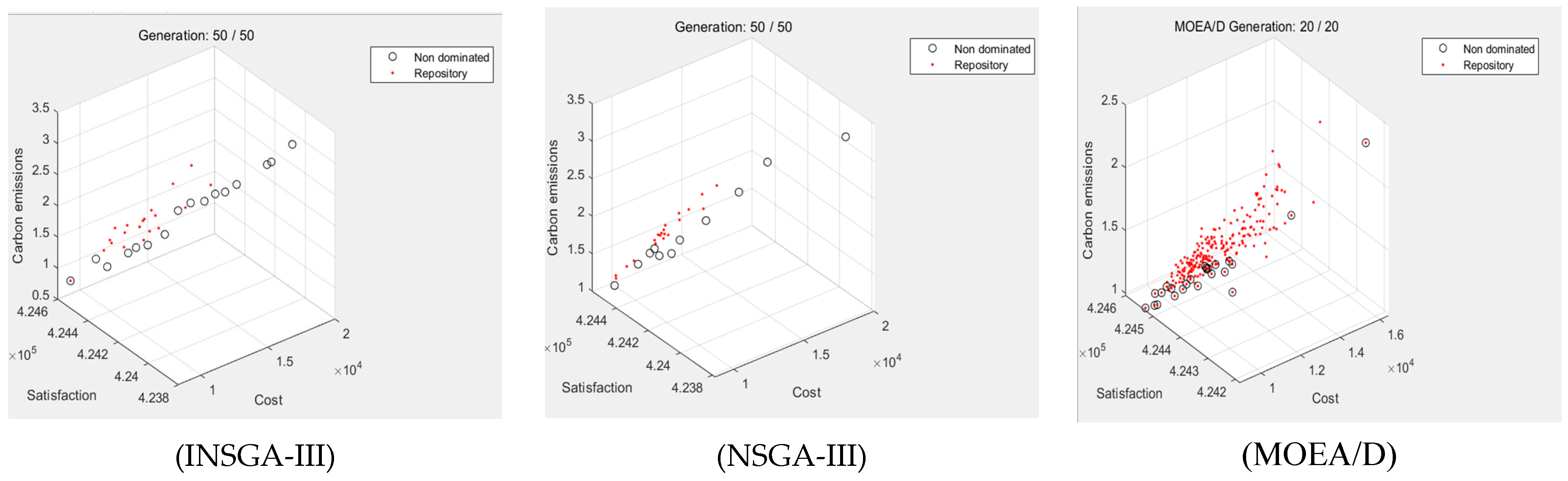 Figure 3)—providing decision-makers with comprehensive options. This explains why the solution set achieves both high quality and high diversity. Through non-dominated sorting and reference point-based selection, the framework ensures the preservation of elite solutions in each generation and guides the population toward a uniformly distributed Pareto front. This constitutes the fundamental institutional guarantee for INSGA-III’s ability to maintain rapid convergence while still achieving excellent diversity in its solution set (as demonstrated by the wide and uniform distribution shown in