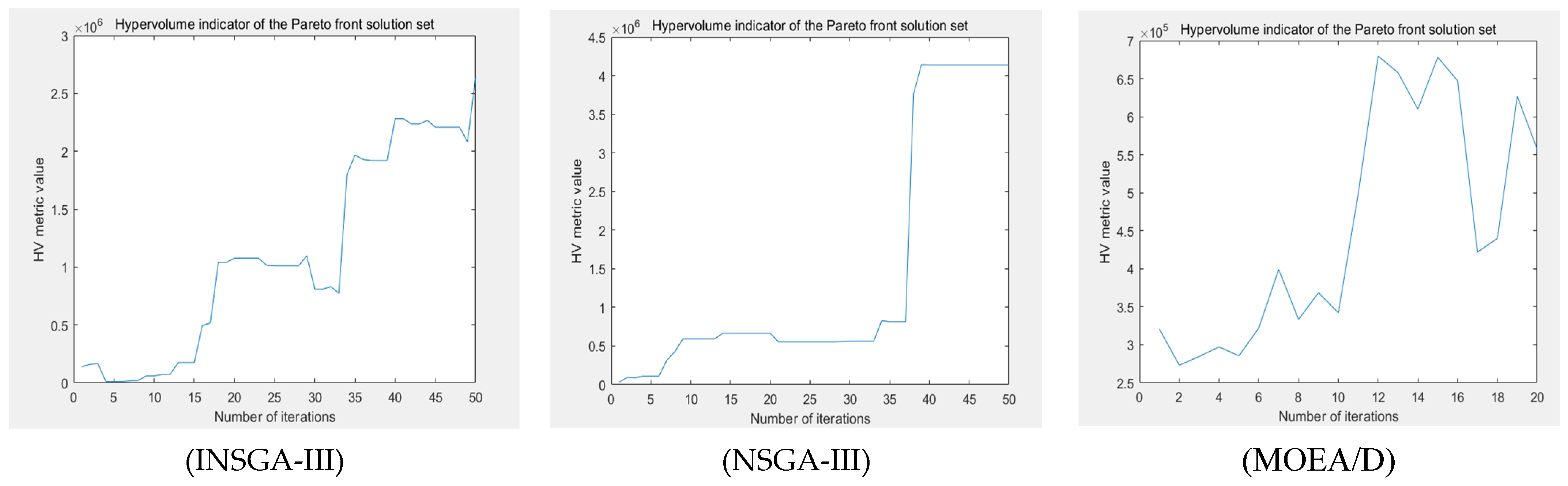 Stable and Refined Search Capability: During the middle and late stages of evolution, the curve of INSGA-III stabilizes and converges to a higher HV plateau, whereas other algorithms tend to stagnate prematurely or converge at lower levels. This demonstrates the overall robustness and sustained optimization capability of the proposed algorithm. Specifically, Improvement 3 (dynamic polynomial mutation) effectively balances exploration and exploitation, mitigating premature convergence and enabling more refined search in later stages, thereby yielding a final solution set with superior comprehensive quality.