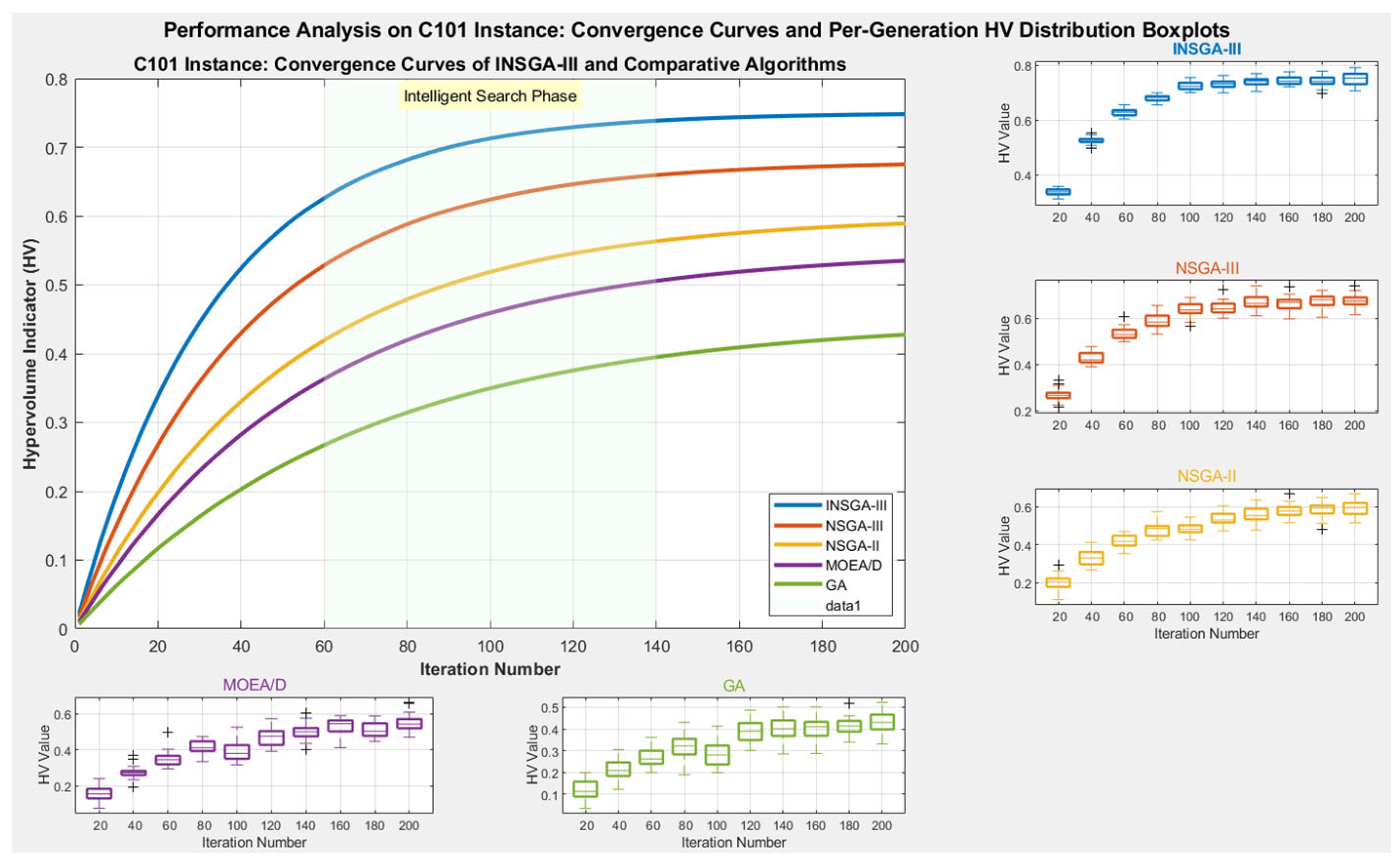 Figure 4 illustrates the trend of the average HV value with respect to the iteration count for each algorithm on the representative C101 instance.