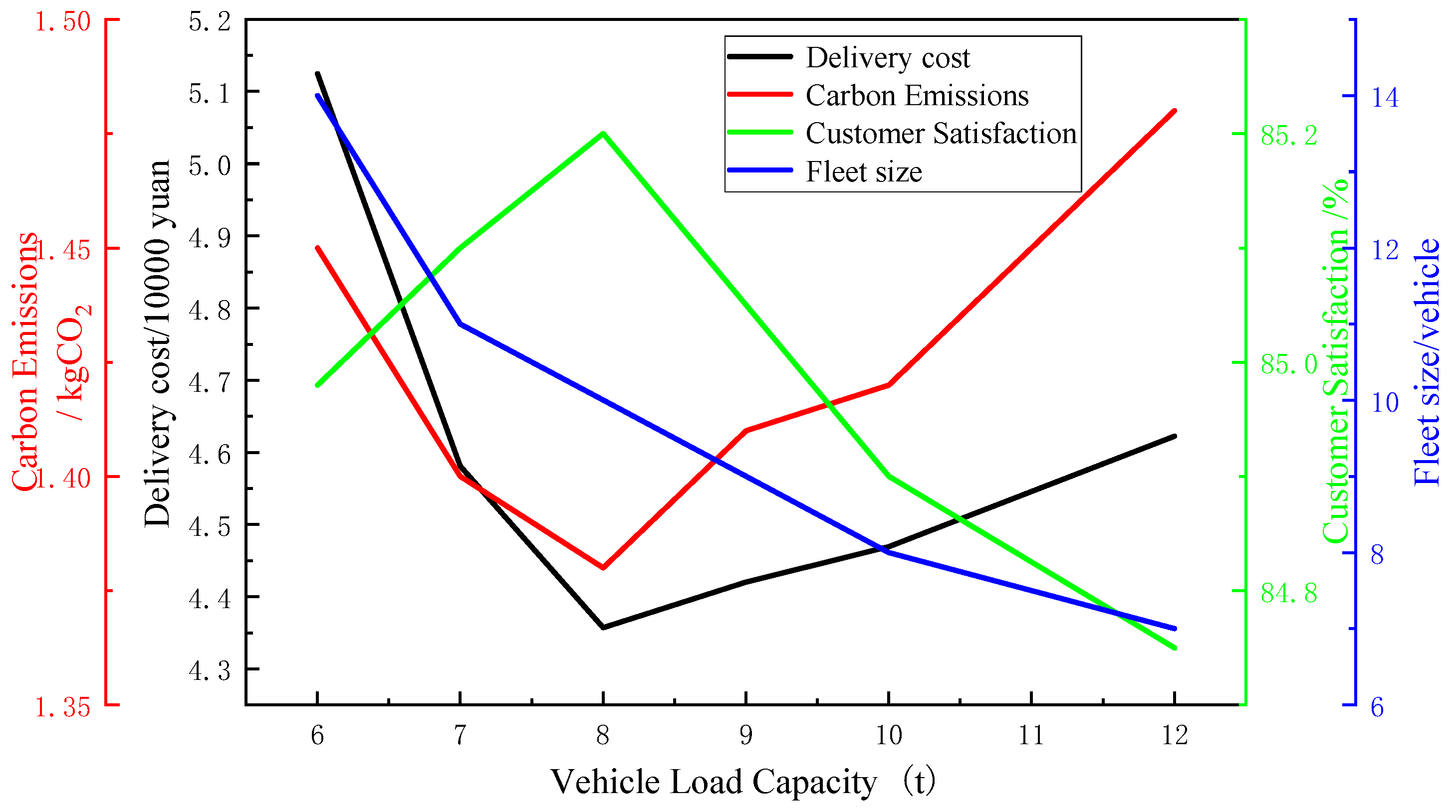 Figure 8, the horizontal axis represents vehicle load capacity, the left vertical axis represents cost and carbon emissions, and the right vertical axis represents customer satisfaction and the number of vehicles. The total cost exhibits a U-shaped curve, reaching its minimum at 8 t; customer satisfaction follows an inverted U-shaped curve, peaking at 8 t; the number of vehicles monotonically decreases as load capacity increases; and carbon emissions show a slowly rising trend. The trend of the impact of vehicle capacity on operational indicators is shown in