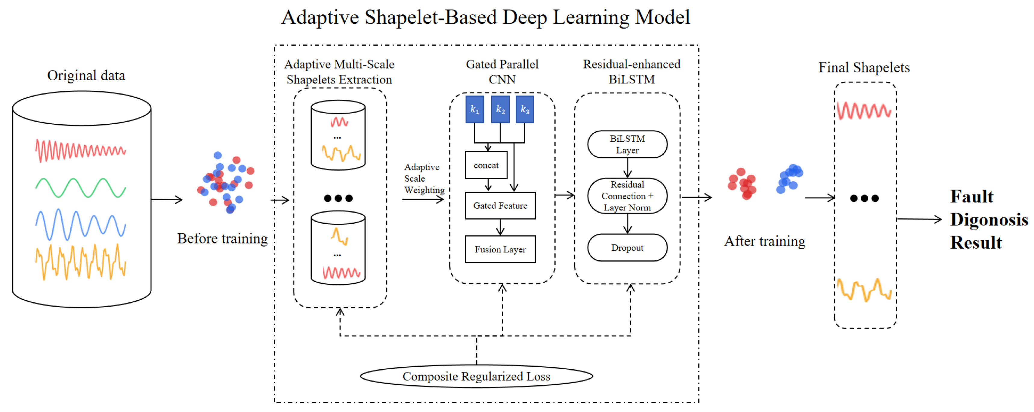 in Equation (3) are global trainable parameters shared across all samples and remain fixed during inference. Fault-type adaptation is achieved by the input-dependent multi-scale shapelet responses and the subsequent gated CNN fusion in